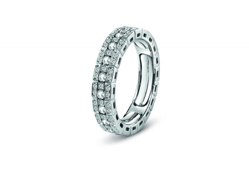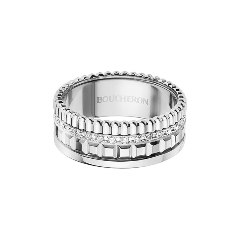 If traditional designs are a no-go, opt for Boucheron’s Radiant Edition in monochromatic white gold. The Quatre ring is more of a jewelry sculpture, with its Radiant Edition line evoking an ode to graphic silhouettes. This ring is stylish, without a doubt and is quite a bold choice.