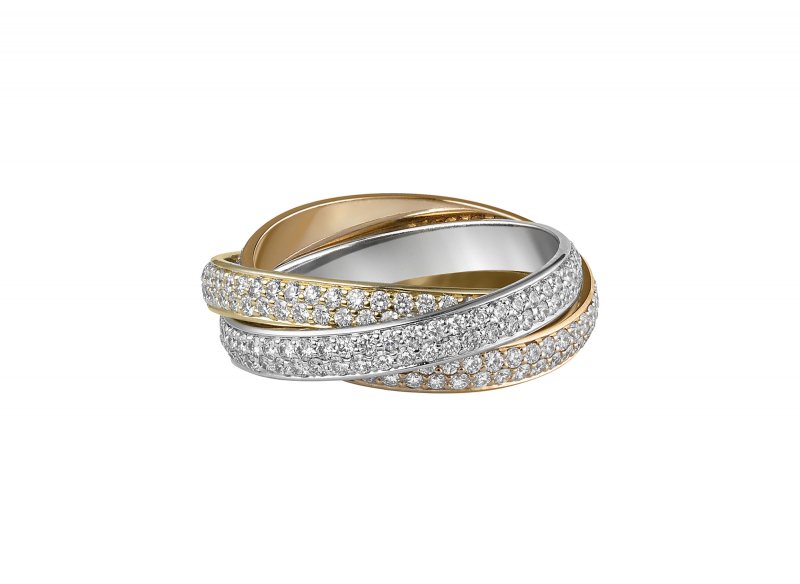 Lots of brides are moving away from the traditional yellow gold rings and exploring rings designed in white gold, yellow and rose gold. Trinity de Cartier from Cartier is a sentimental ring featuring three interlinked bands in white, yellow and pink gold, all adorned with two rows of tiny diamonds.