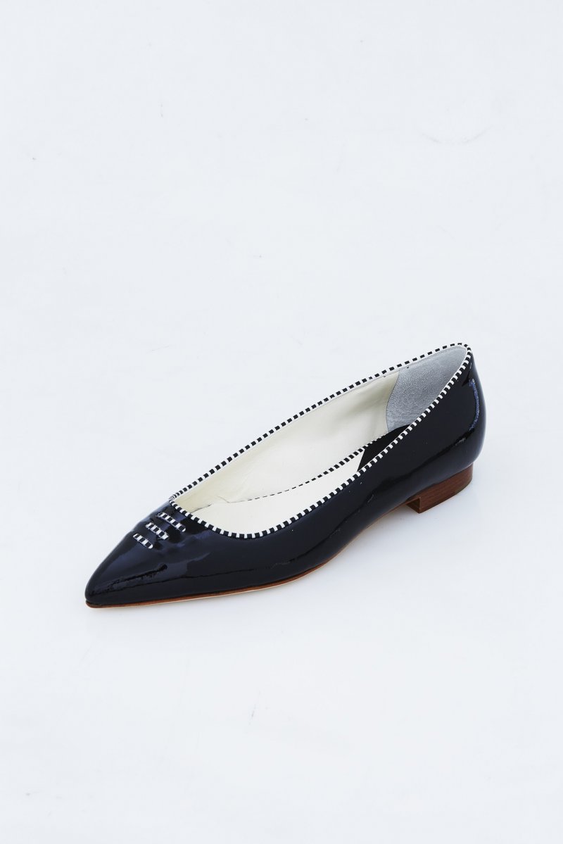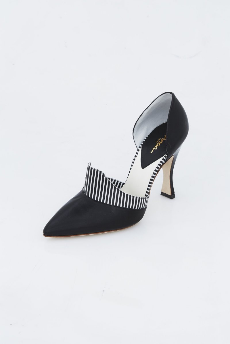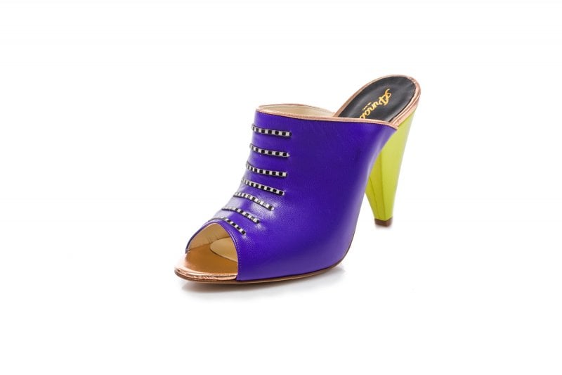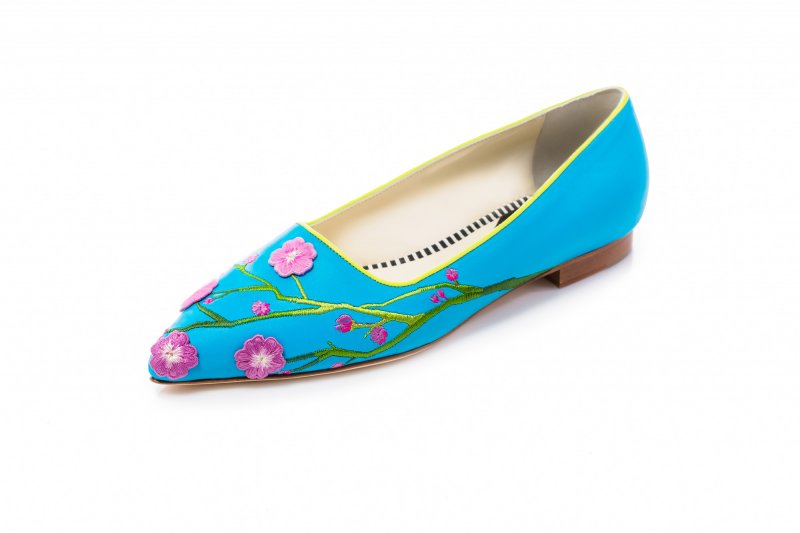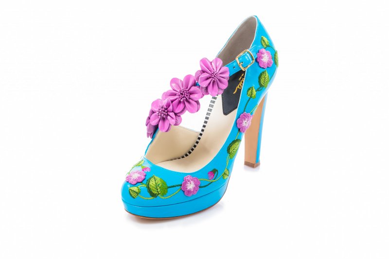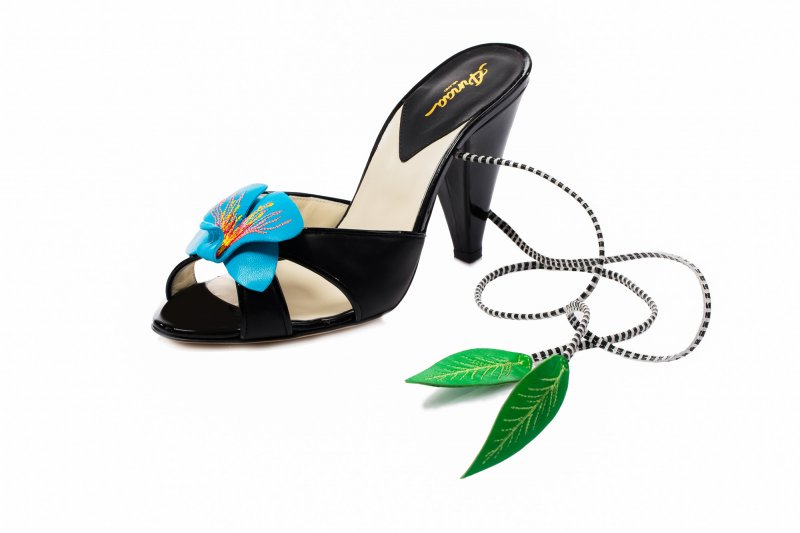 Her Spring-Summer 2016 collection is like an allusion of the botanical world, mixed-and-matched with the pop fantasy culture of the 80’s. The collection draws on floral aspirations, painting a colorful canvas of 3D leather flowers in pink, turquoise and violet. Another model features a patent leather cone-heeled sandal completed with a leafy ankle strap. Orchids and cherry blossom flowers find their way into designs in the most beautiful and intricate forms of embroideries, while the staple black and white stripes invade inner soles.