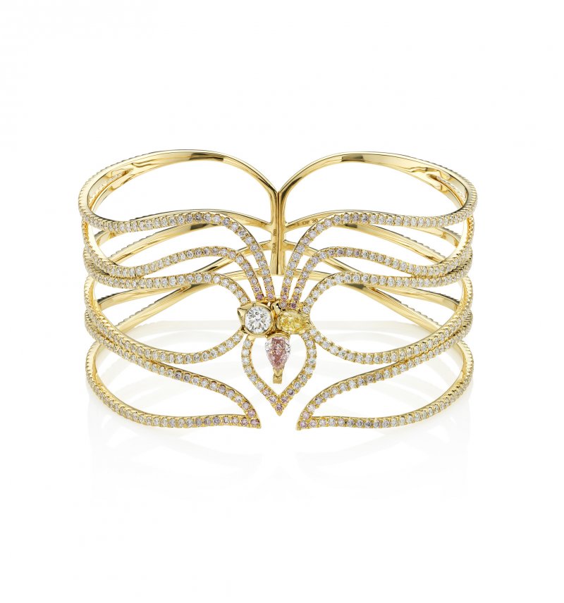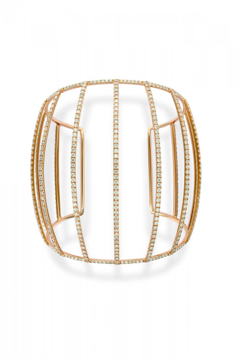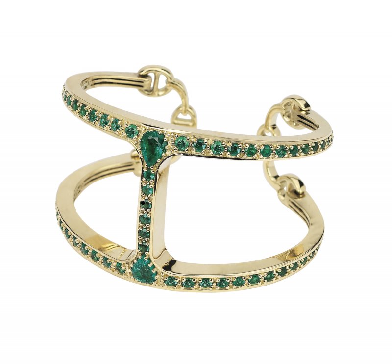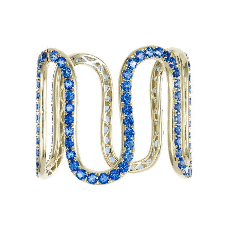 Other cut-out styles cuffs include Fabergé’s stunning Emotion Gypsy Ruby Bangle, Gemfields' lovely Zambian emerald bracelet by Hoorsenbuhs, the new Silene cuff from AW Mouzannar and Zaha Hadid, the celestial Astraeus cuff inspired by Asteria – the Greek god of stars by Star Diamonds, the electro-chic blue topaz Memphis collection wiggly cuff by Sabine G, the elegant gold Vasilisa cuff by Annoushka Ducas, featuring grain motifs, designed as a tribute to her grandfather who was a Russian grain trader and the interesting Chakra series by Arlene Bonnant for her label Caspita.