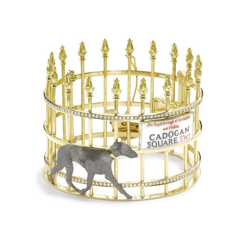 British jeweler Theo Fennell draws upon British sense of humour for his playful cuffs. His Cadogan Square cuff-bangle features hand-painted enamelled street sign and pet dogs affixed to the gold railings. Want to personalise it? This sure can be done, as bespoke commissions ensure that any place and street in the world, along with street signs and your own pet can adorn your cuff.