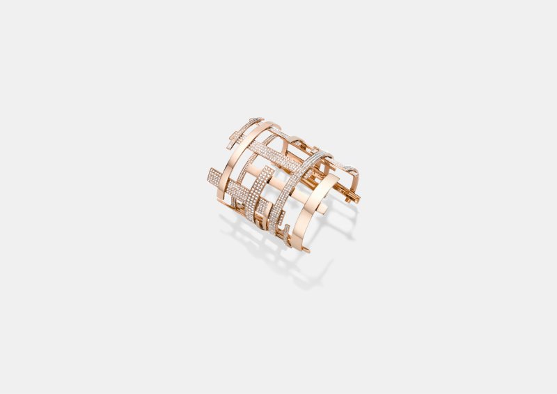 Cuffs from Collection I and II by Charlotte Dauphin de la Rochefoucauld for her label, Dauphin, are minimalistic and organic. “The rose gold cuff is conceived as an extension of the body itself, of the natural curves of a woman’s body,” says Charlotte, who explores the playful arrangement of positive and negative spaces. Another interesting piece by Charlotte is a layered cuff that reflects the concept of time and its visual representations.
