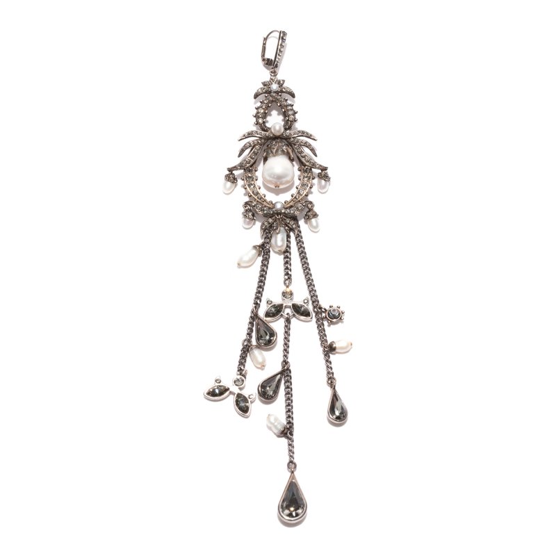 Oversized and zealous, the earrings are embellished with Swarovski, baroque and river pearls at times and with Swarovski crystals and asymmetrical chain fringes at other times. The earrings can be purchased either on their own or together, making them all the more distinct.