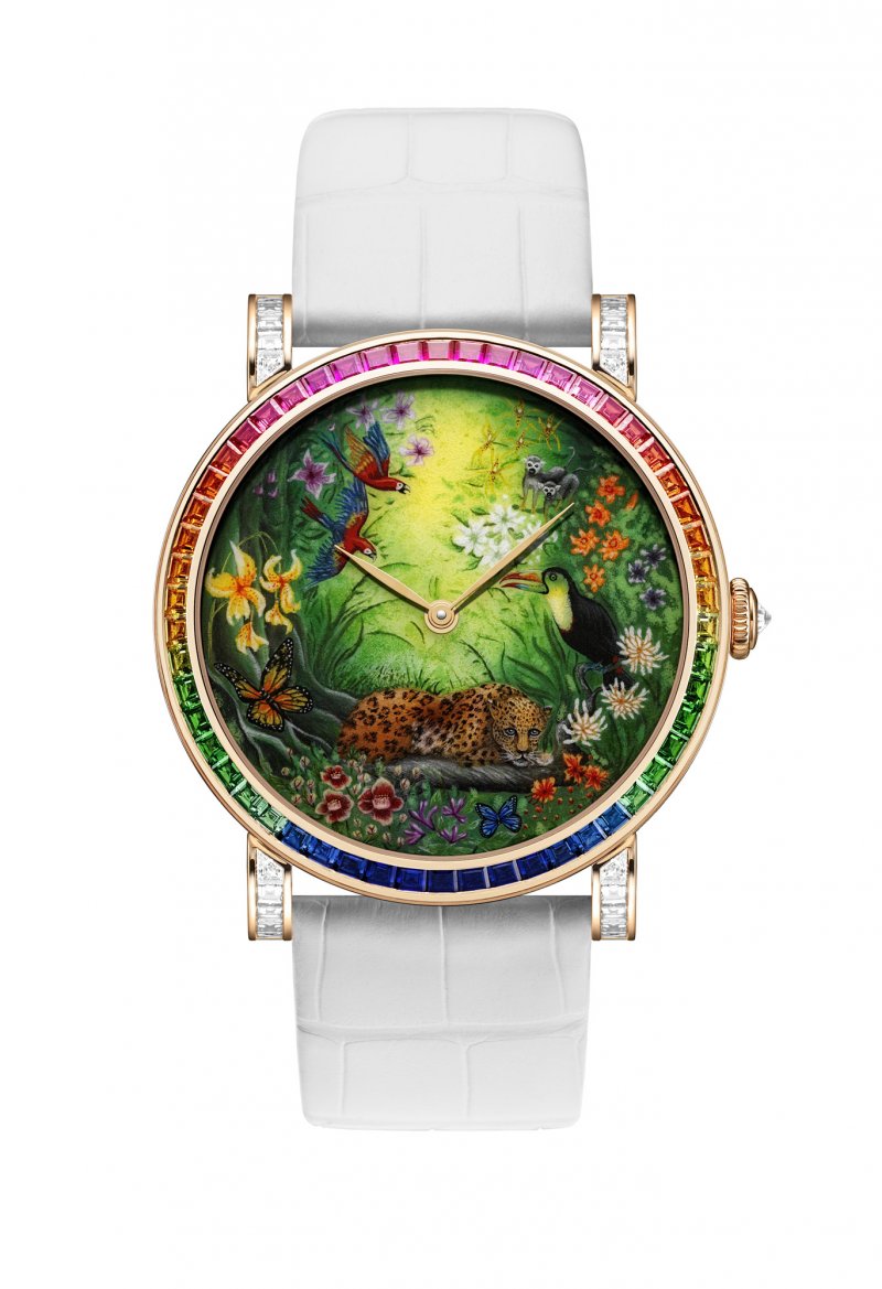 If you love art, you might like the Elements watch by DeLaneau. Unveiled at SIHH in January, the Elements timepiece – featuring ‘la peinture miniature sous fondant or miniature painting with enamel – brings to life the animal kingdom replete with a lush green forest.