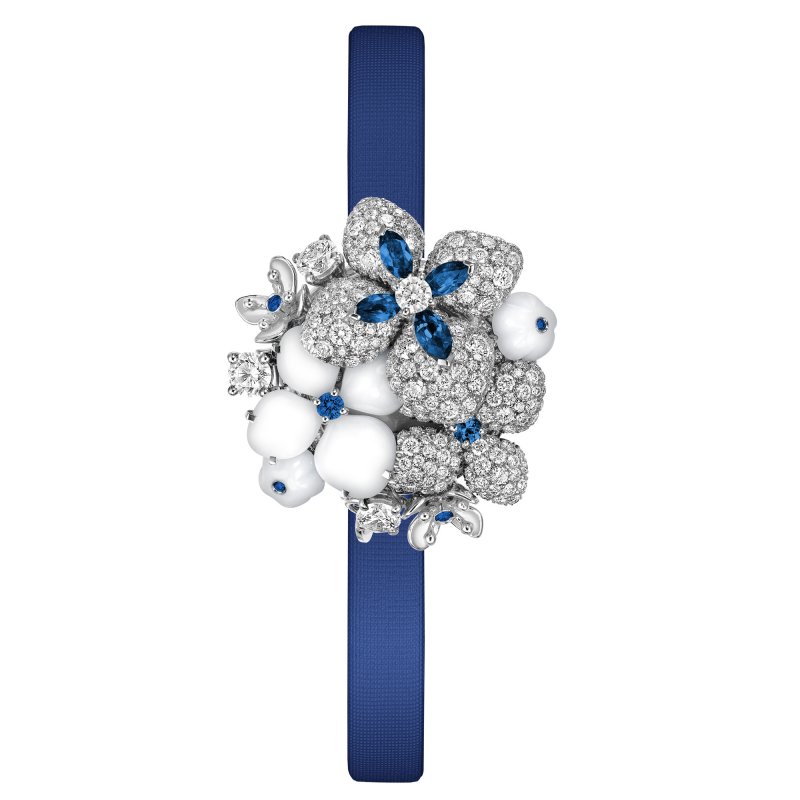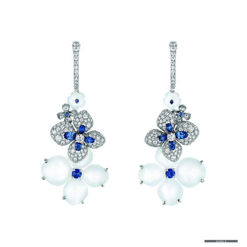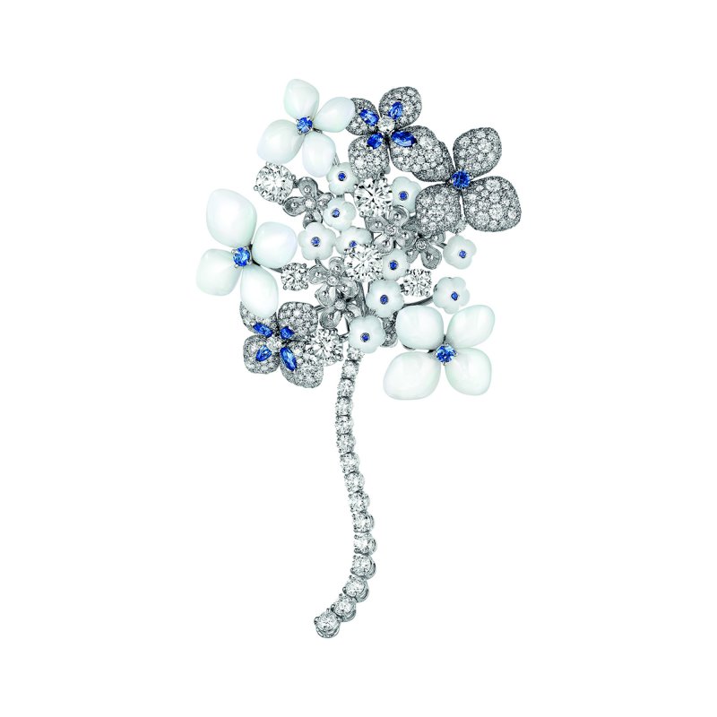 The jewelry pieces take us to a clear summer night, when a soft light is reflected on a sleeping flower in the garden. The stars’ milky shade lends a cool symphony of blue to the “Hortensia” flower through a fusion of sapphires, tanzanites, diamonds and white chalcedony.