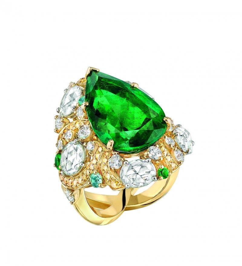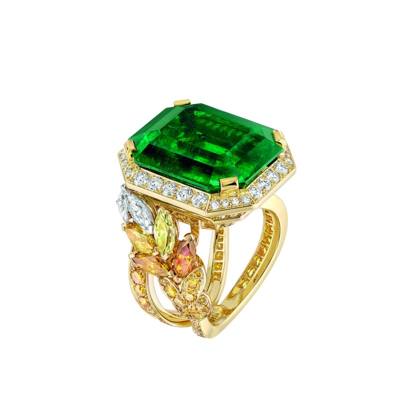 Epi d’Ete ring in platinum, 18-carat yellow gold, one emerald and diamonds