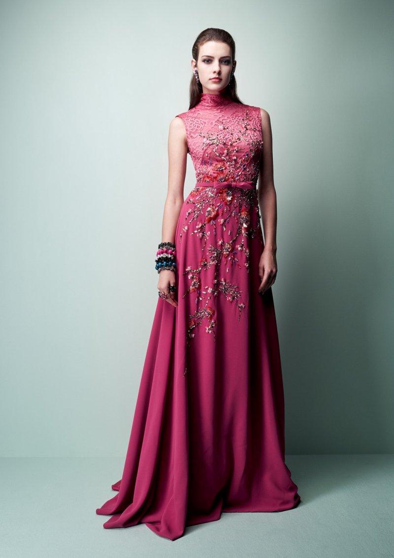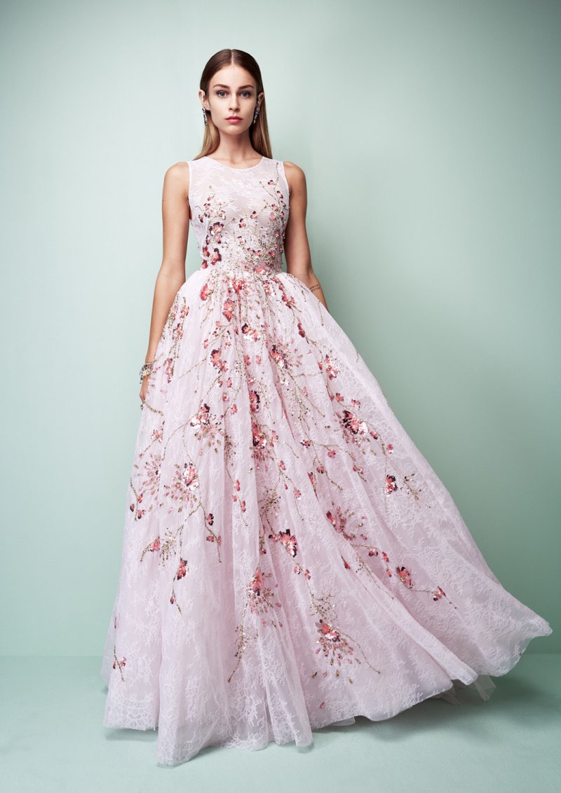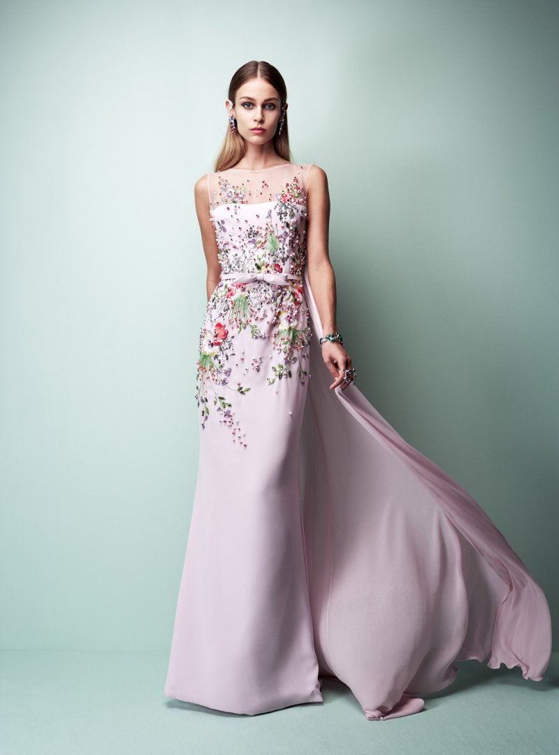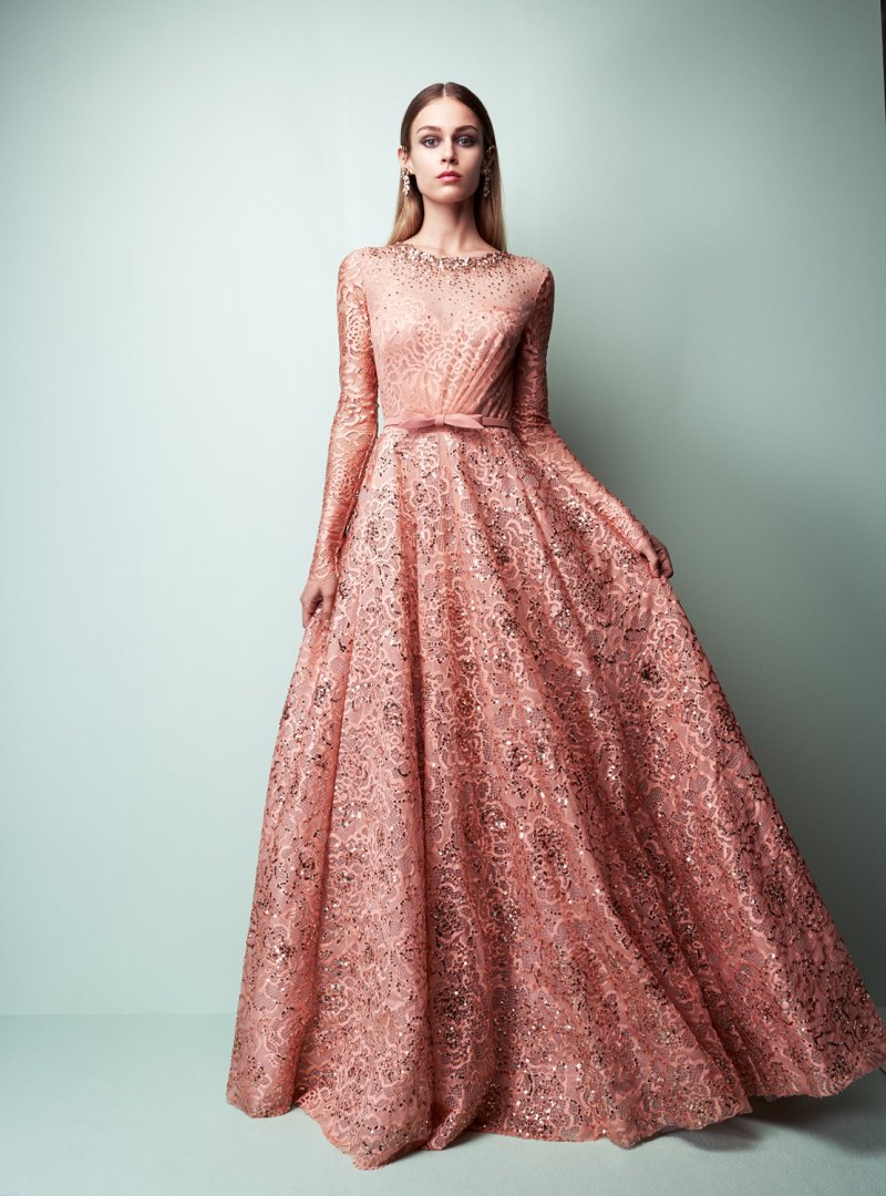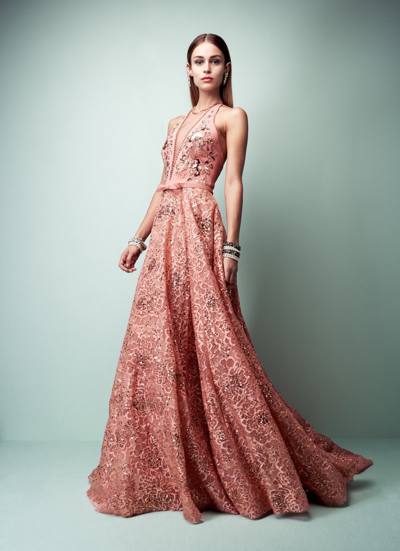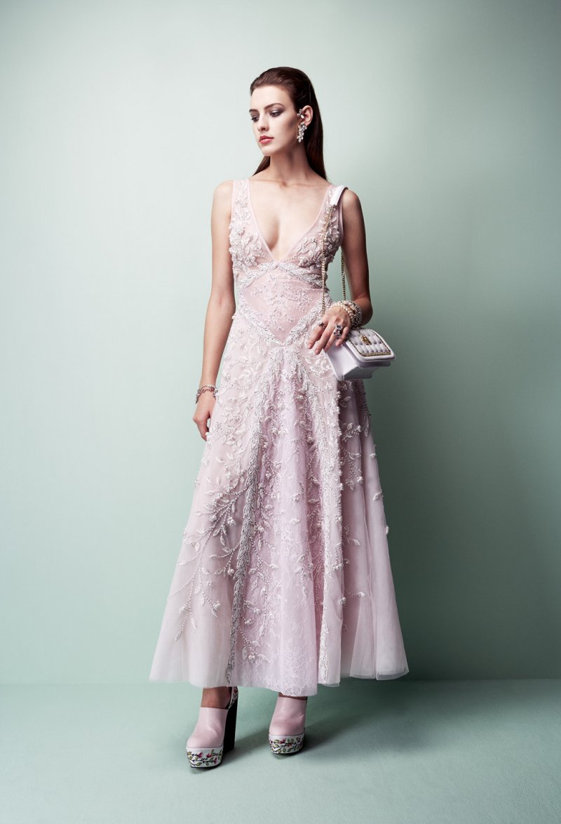 The line-up of dresses and tunics seem to be alluding to the mesmerizing movement of the ocean and its waves, hence painting a canvas full of the joys of lace adding, reminiscent motifs and dynamic lines. Flowing dresses with majestic bustiers have been a Hobeika specialty forever, but this time, the raw magnetism was enhanced through a cape-shouldered tunic, a high-slit gown featuring a sequined leg, evasé dresses with bowed belts at the waist, lightweight coats on tunics, chiffon fabrics and a whole lot of ocean-bound crafts. The color palette recalls the tones of the fauna and flora of the aquatic world, as colors skew from turquoise, emerald green, pink and orange. The cascade of embroideries, crystals and pearls melt away in the designs, proving yet again the designer’s ardor for the ocean.