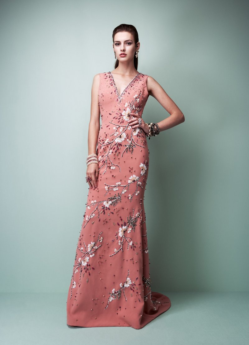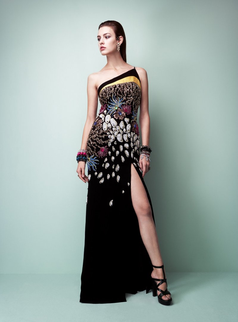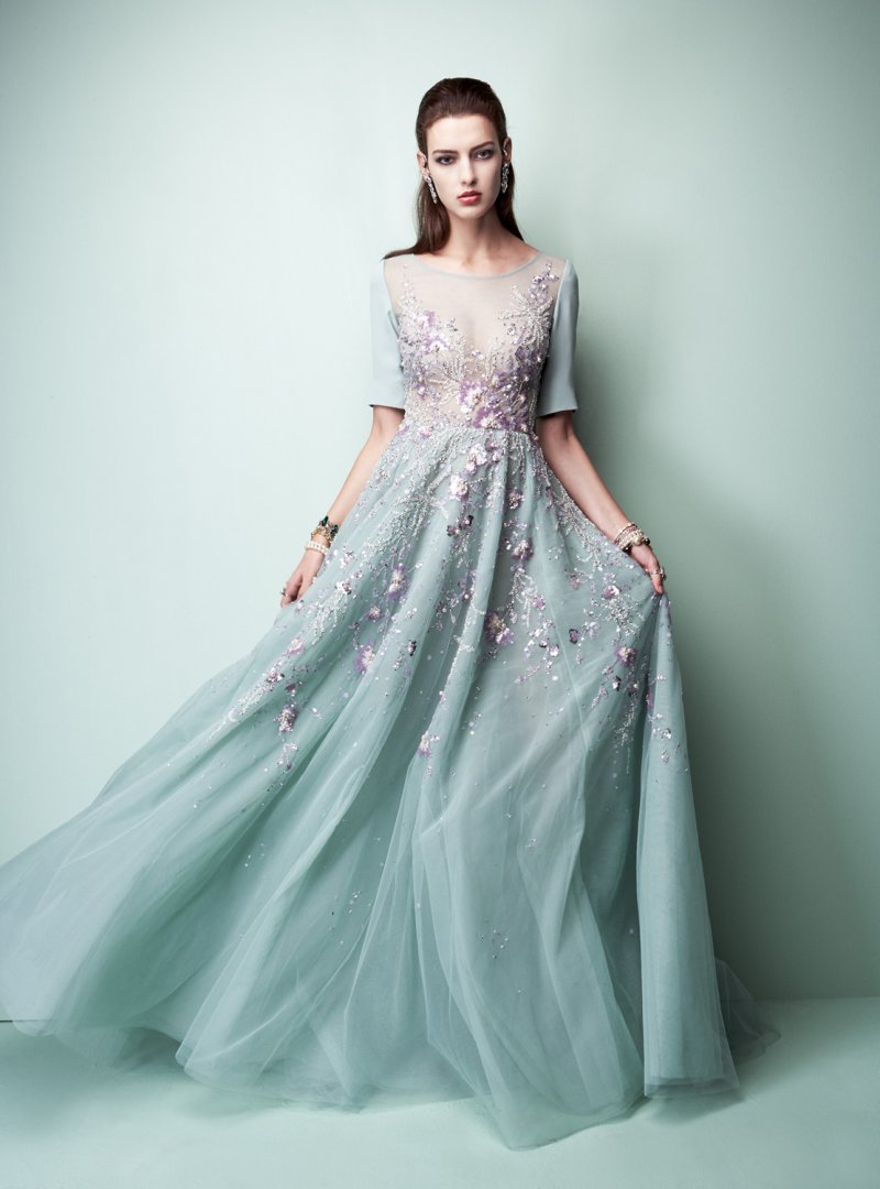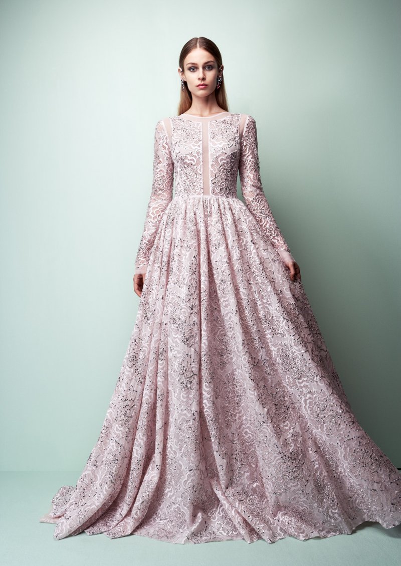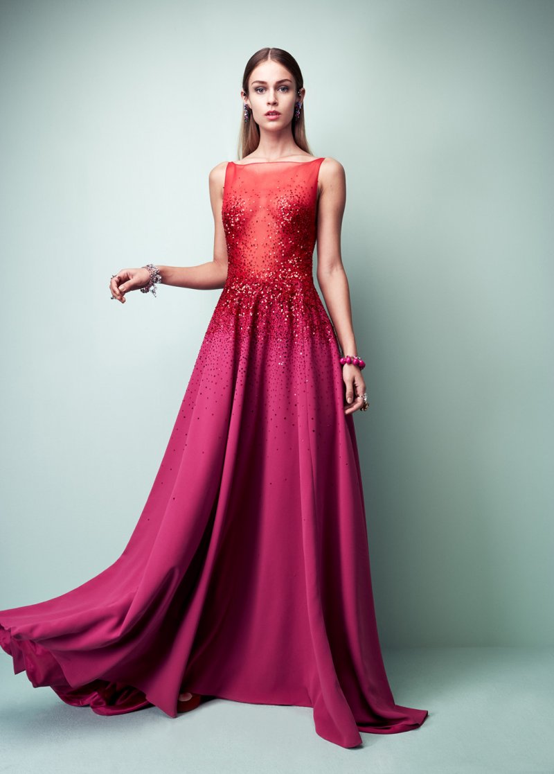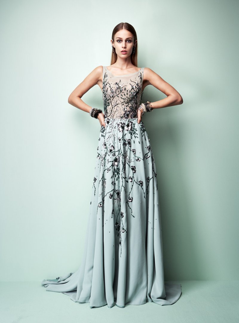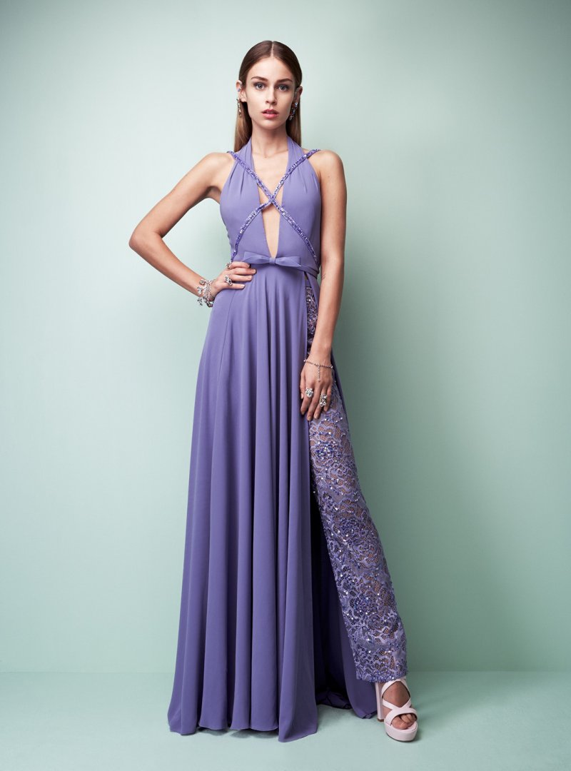 The line-up of dresses and tunics seem to be alluding to the mesmerizing movement of the ocean and its waves, hence painting a canvas full of the joys of lace adding, reminiscent motifs and dynamic lines. Flowing dresses with majestic bustiers have been a Hobeika specialty forever, but this time, the raw magnetism was enhanced through a cape-shouldered tunic, a high-slit gown featuring a sequined leg, evasé dresses with bowed belts at the waist, lightweight coats on tunics, chiffon fabrics and a whole lot of ocean-bound crafts. The color palette recalls the tones of the fauna and flora of the aquatic world, as colors skew from turquoise, emerald green, pink and orange. The cascade of embroideries, crystals and pearls melt away in the designs, proving yet again the designer’s ardor for the ocean.