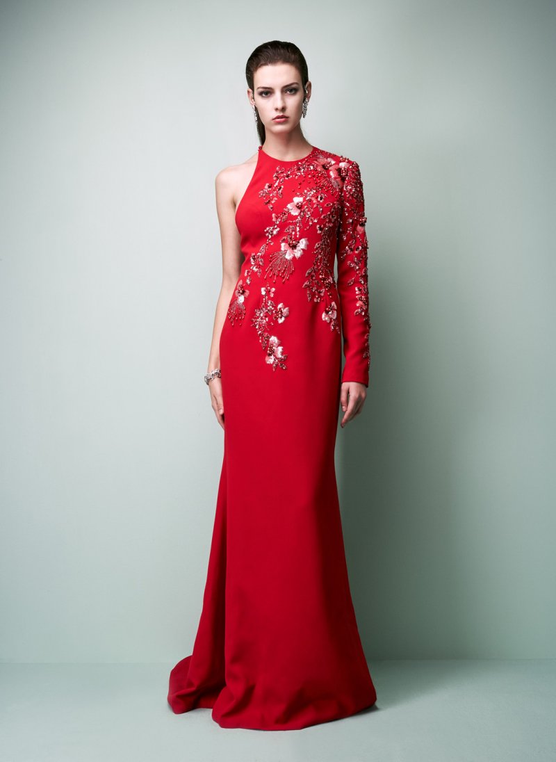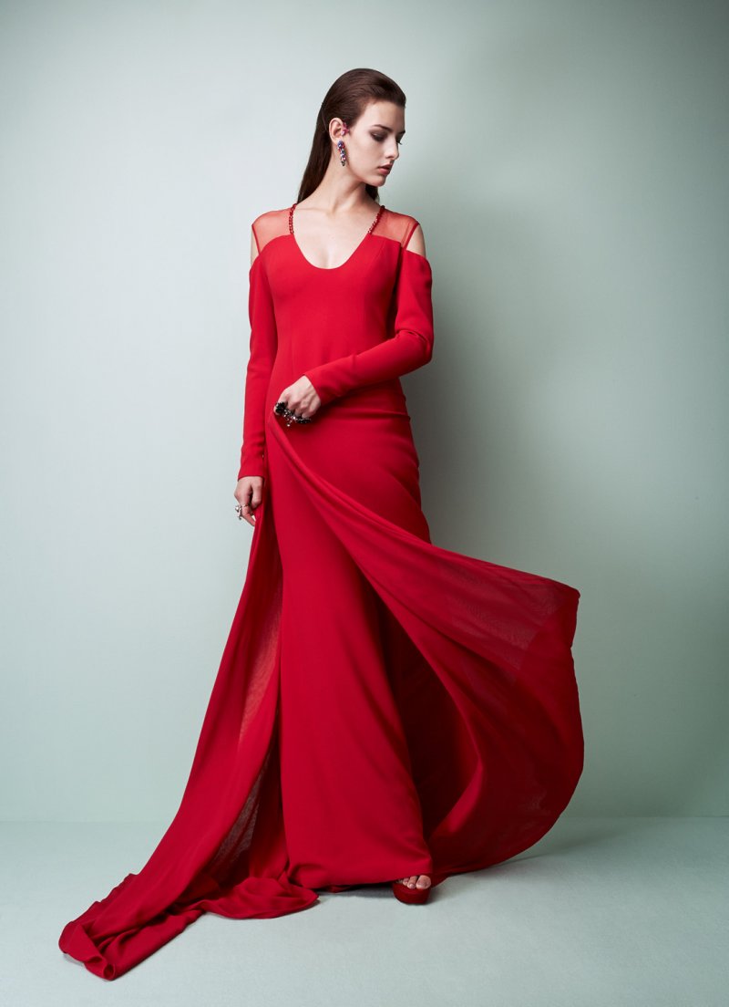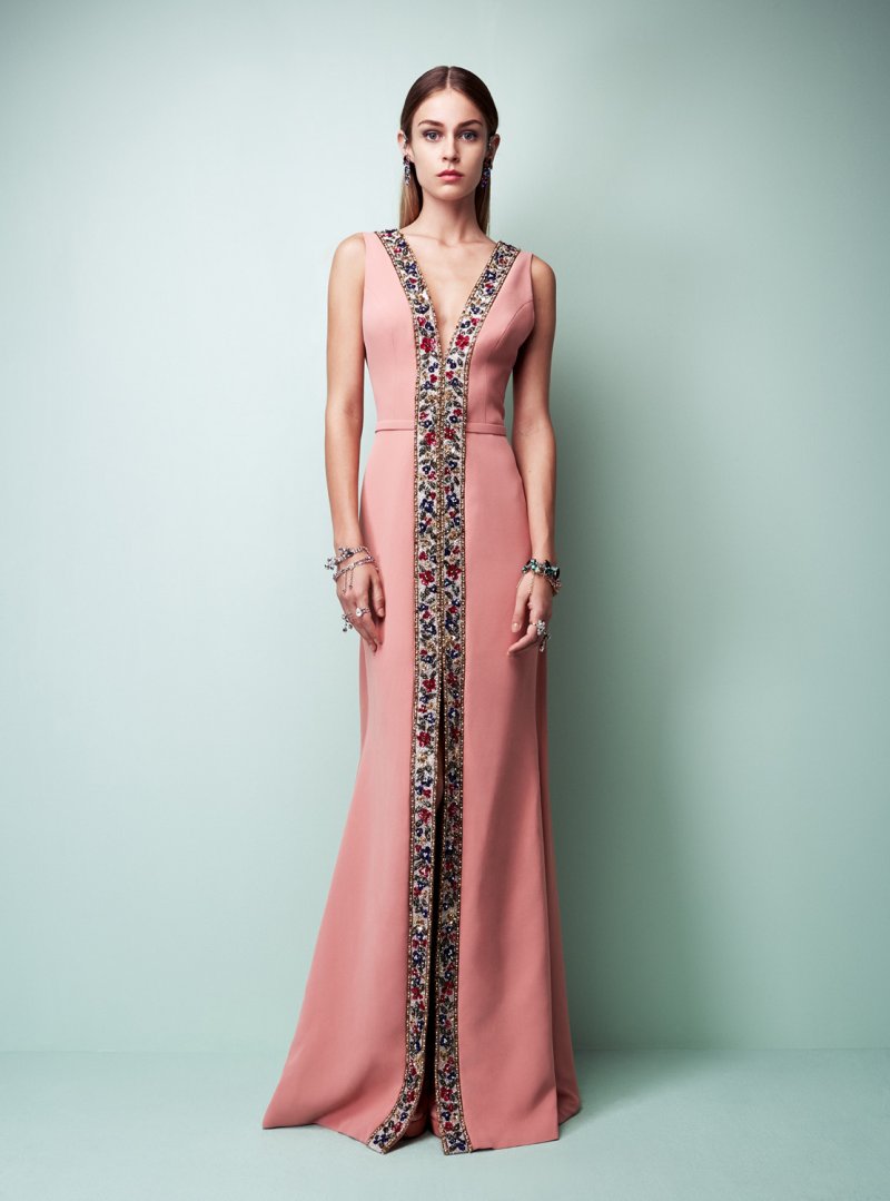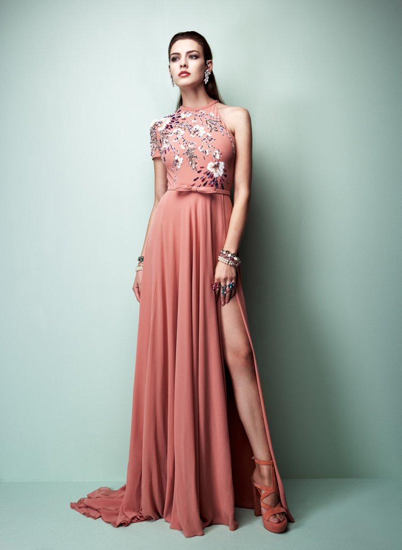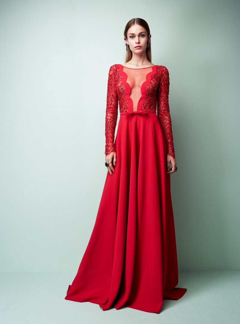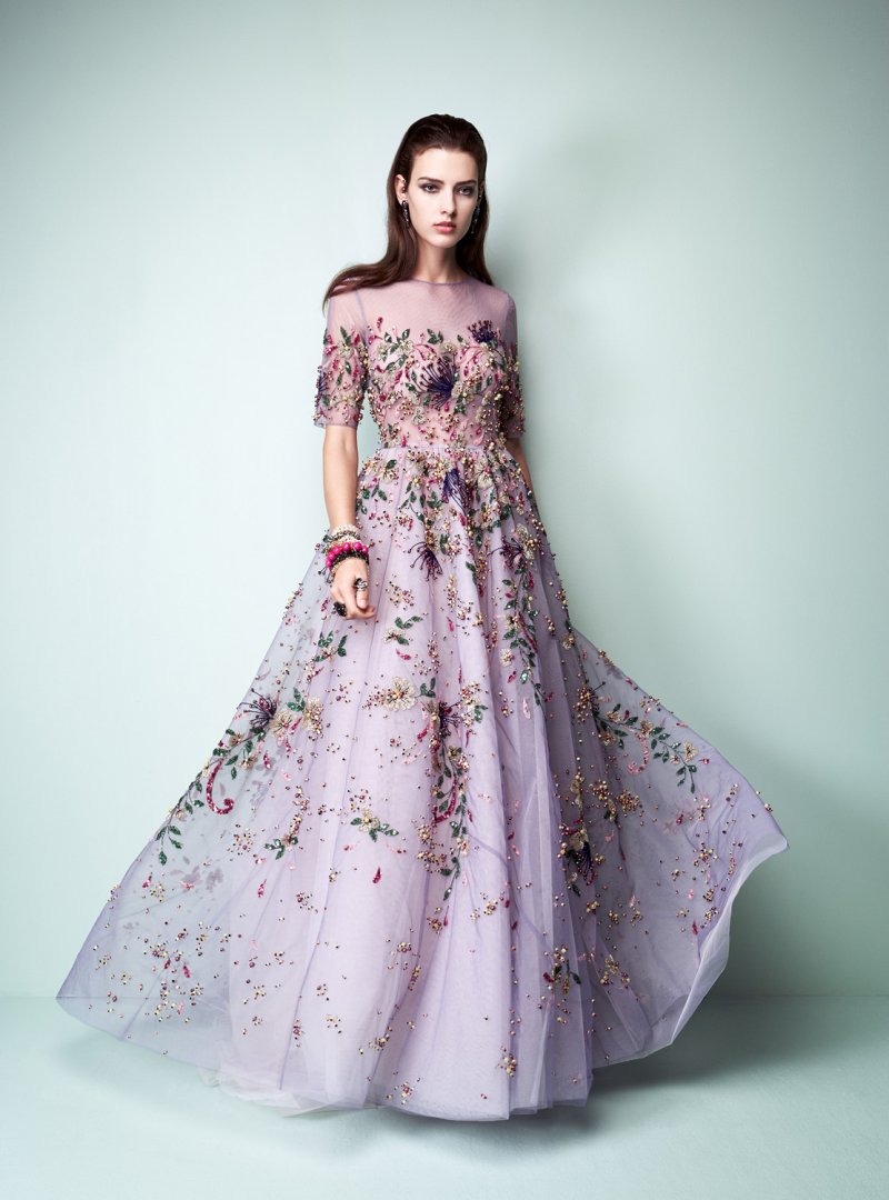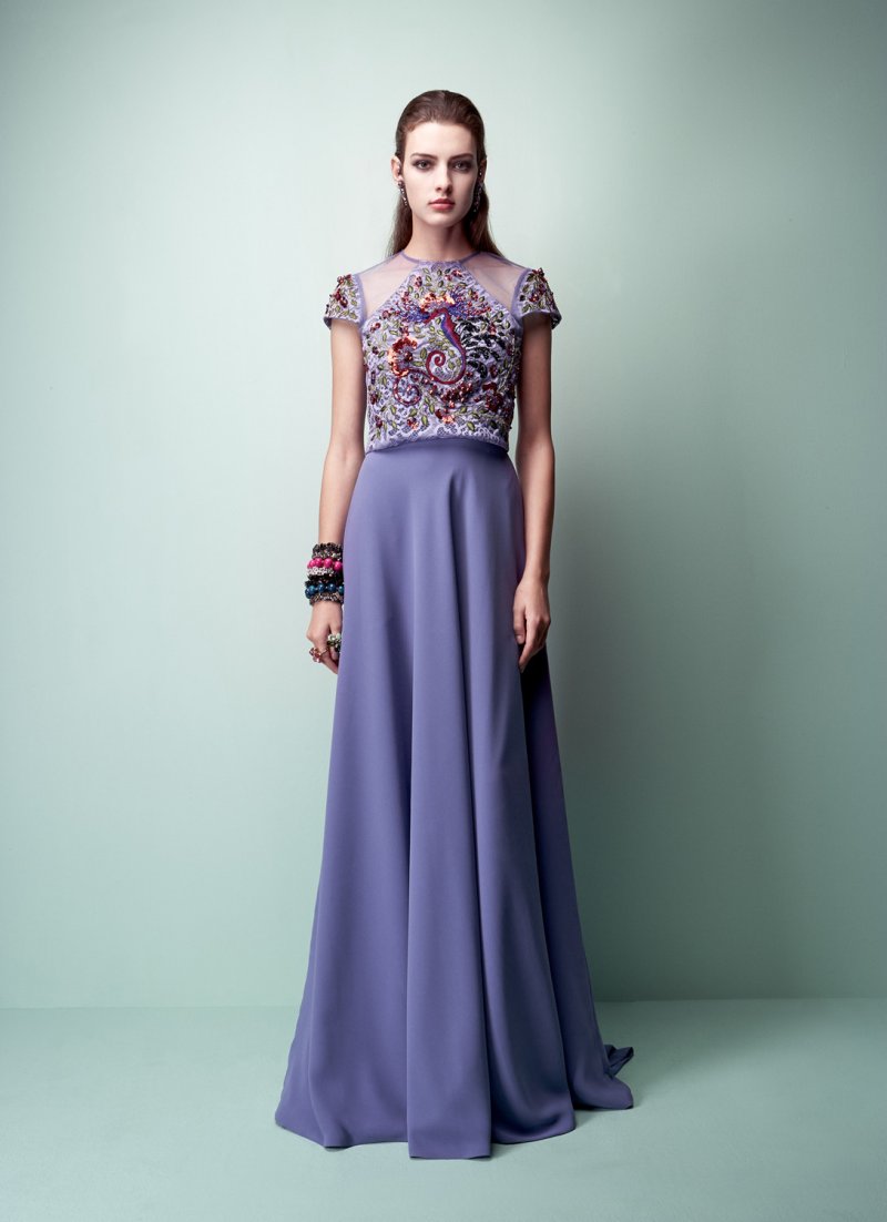 The line-up of dresses and tunics seem to be alluding to the mesmerizing movement of the ocean and its waves, hence painting a canvas full of the joys of lace adding, reminiscent motifs and dynamic lines. Flowing dresses with majestic bustiers have been a Hobeika specialty forever, but this time, the raw magnetism was enhanced through a cape-shouldered tunic, a high-slit gown featuring a sequined leg, evasé dresses with bowed belts at the waist, lightweight coats on tunics, chiffon fabrics and a whole lot of ocean-bound crafts. The color palette recalls the tones of the fauna and flora of the aquatic world, as colors skew from turquoise, emerald green, pink and orange. The cascade of embroideries, crystals and pearls melt away in the designs, proving yet again the designer’s ardor for the ocean.
