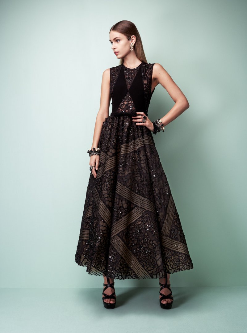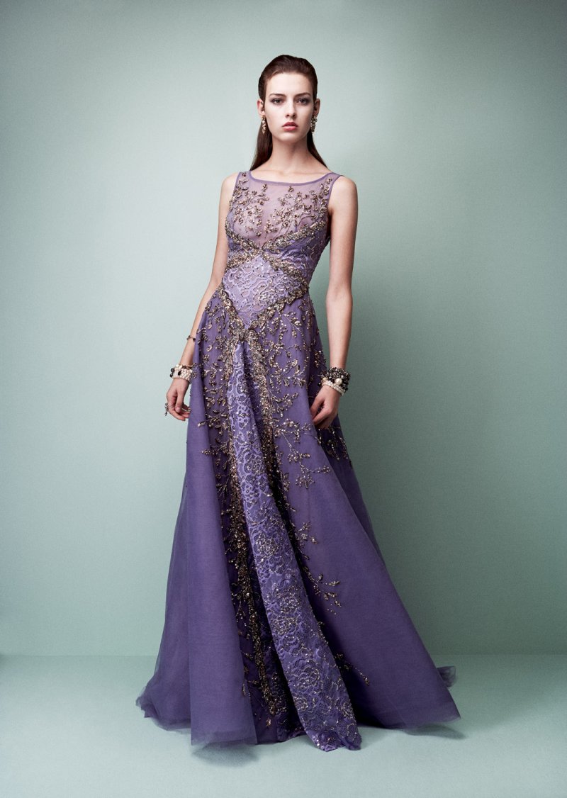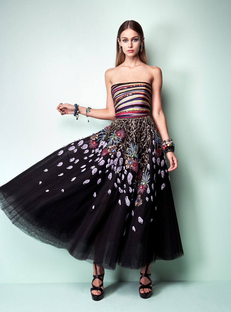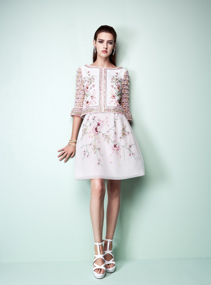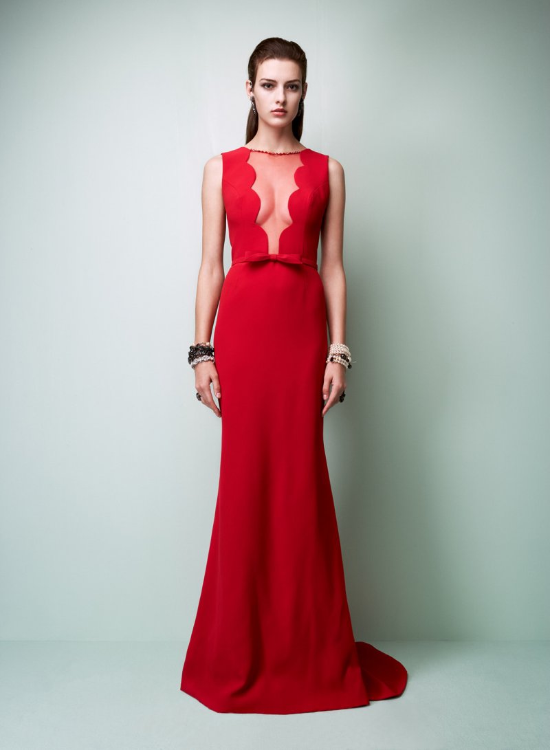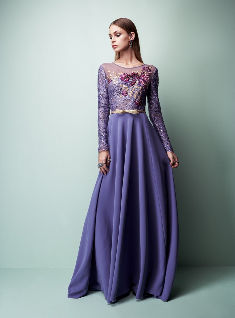 The line-up of dresses and tunics seem to be alluding to the mesmerizing movement of the ocean and its waves, hence painting a canvas full of the joys of lace adding, reminiscent motifs and dynamic lines. Flowing dresses with majestic bustiers have been a Hobeika specialty forever, but this time, the raw magnetism was enhanced through a cape-shouldered tunic, a high-slit gown featuring a sequined leg, evasé dresses with bowed belts at the waist, lightweight coats on tunics, chiffon fabrics and a whole lot of ocean-bound crafts. The color palette recalls the tones of the fauna and flora of the aquatic world, as colors skew from turquoise, emerald green, pink and orange. The cascade of embroideries, crystals and pearls melt away in the designs, proving yet again the designer’s ardor for the ocean.