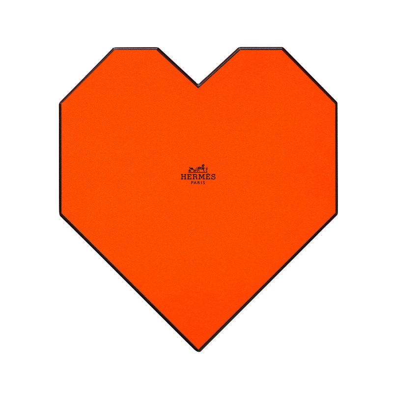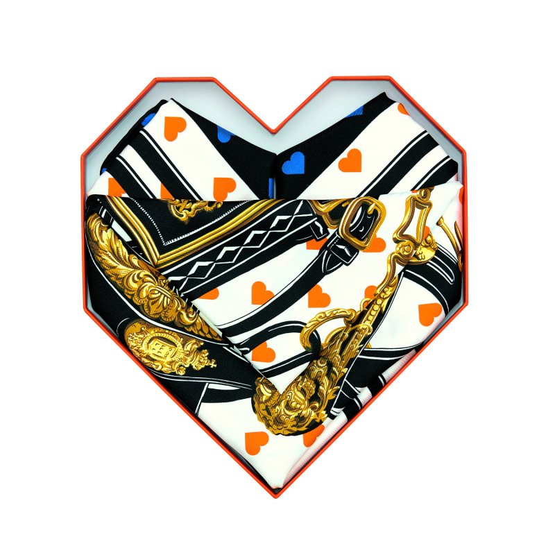 Made out of silk twill and bedazzling its audience in a whirlpool of orange and blue hearts, the exceptional chef d’oeuvre will be delivered to you in a gorgeous heart-shaped orange box.