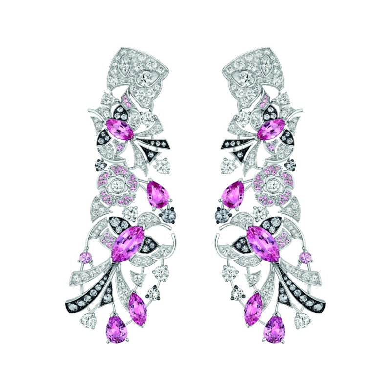 Jeanne earrings in white gold, pink sapphires, diamonds and grey spinels