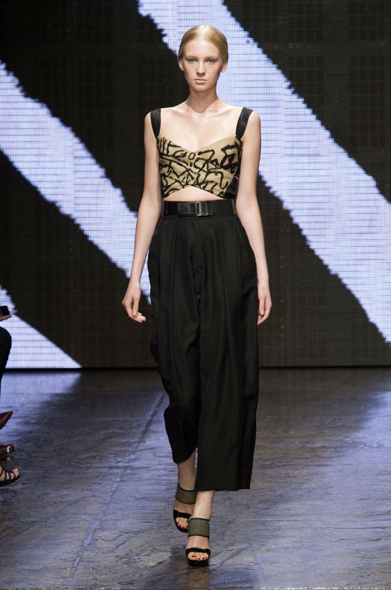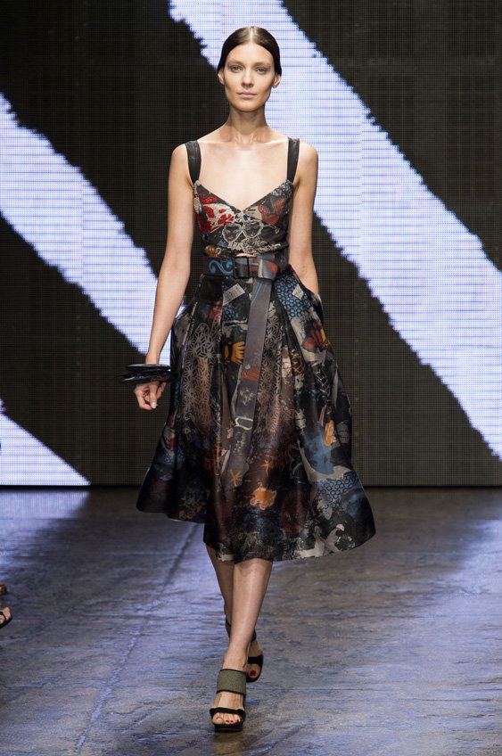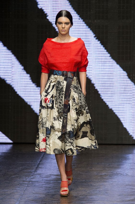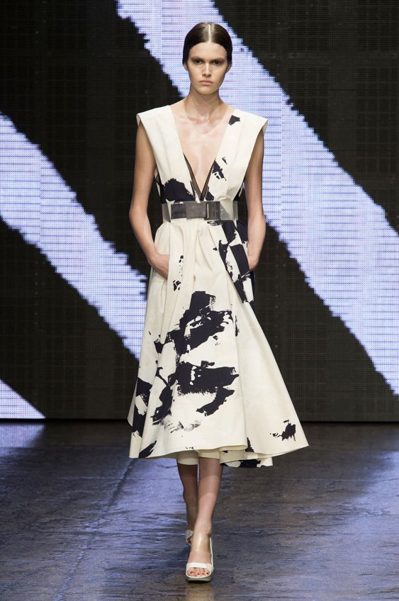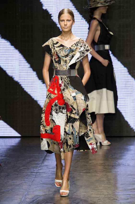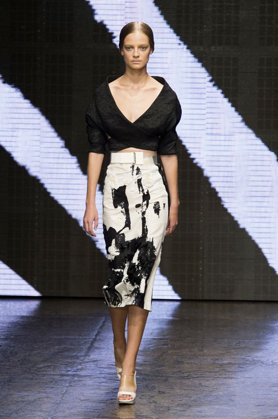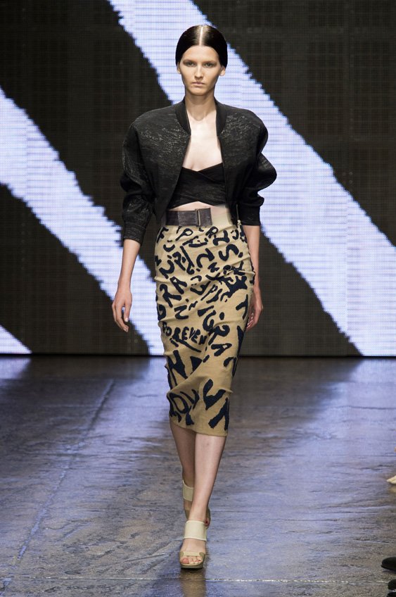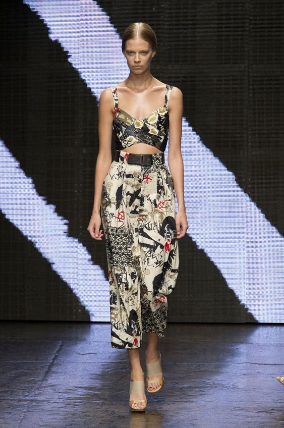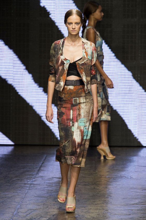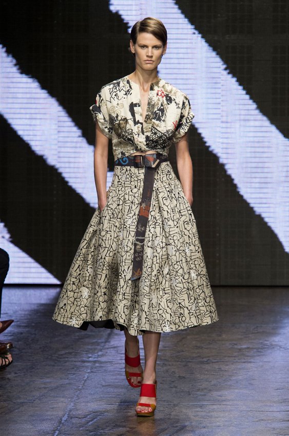 Abstract graffiti, brush strokes and paint splashes were the basis for the collection’s prints and patterns; while bra tops, cropped jackets, pencil and full skirts brought out the 50s silhouettes. It was this marriage of two opposing sensibilities—urban social expression and 1950s conservatism—that created such a fresh and vibrant collection.