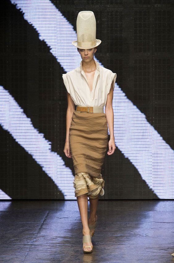 A refreshingly outrageous side of Donna Karan came out today as models donning buffalo hats (à la Pharrell Williams) and graffiti prints swayed down the runway.