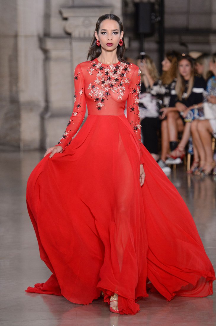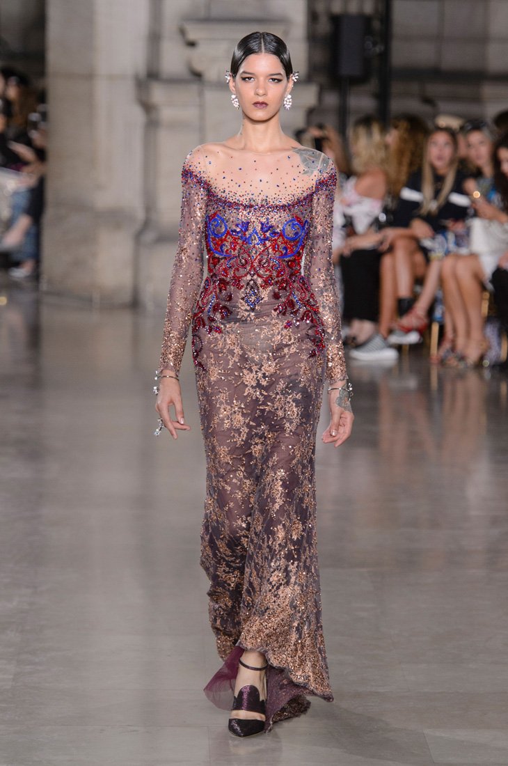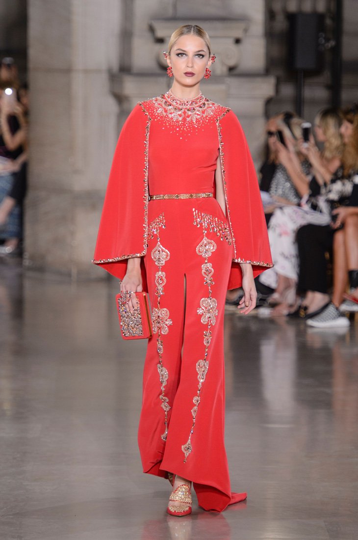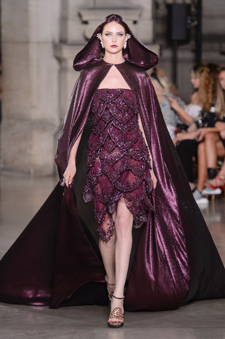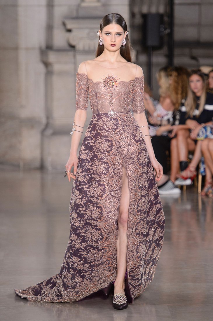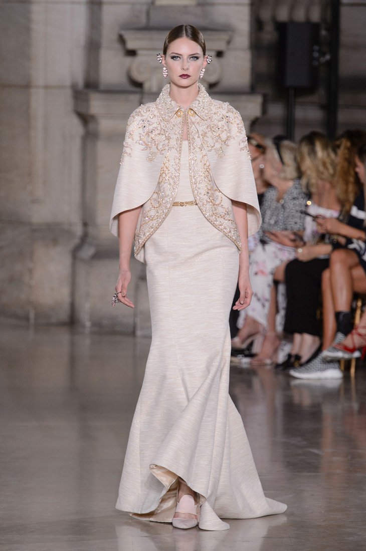 Today, the Lebanese designer Georges Hobeika, who has fashionably made his way to the most elitist Hollywood events, has presented a wave of sumptuous gowns, worthy of his irreverent taste. The show started out as angelic as ever, what with the all-white dresses and the pinkish overall slowly drifting into a billowing cape. Models strutted down the runway in thigh-high gowns, playfully revealing a series of jewel-toned numbers- all of which were carefully bedazzled with oriental embroideries. And then slowly- but surely- the collection turned seductively darker, revealing velvet capes mixed with heart-shaped gowns, brocade wrap dresses and burgundy lamé gowns with statement necklaces and earrings.