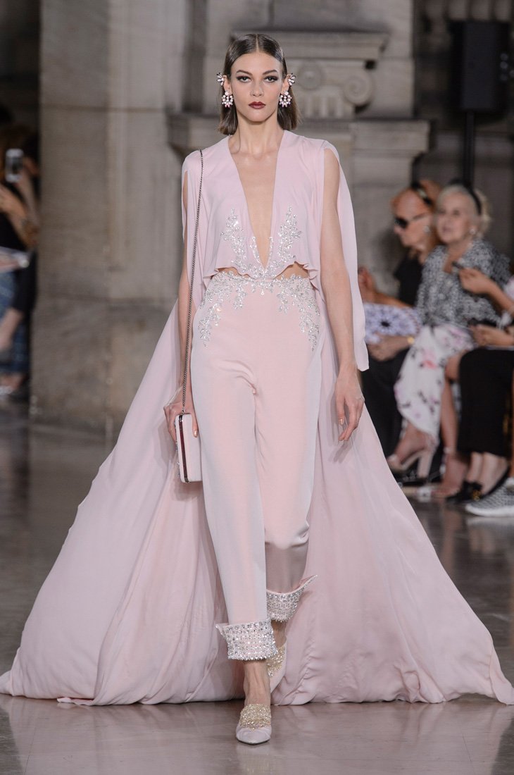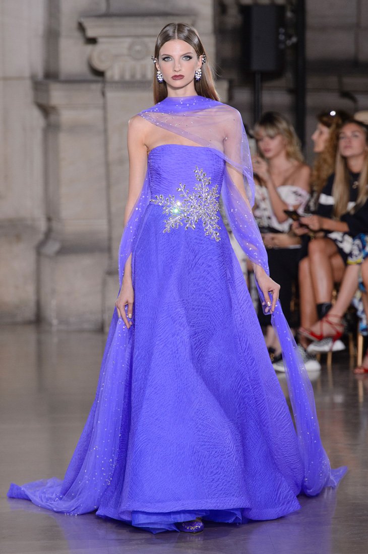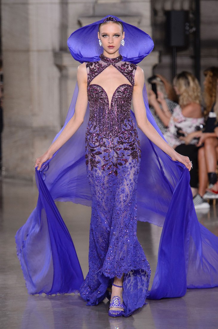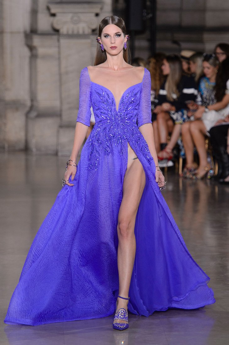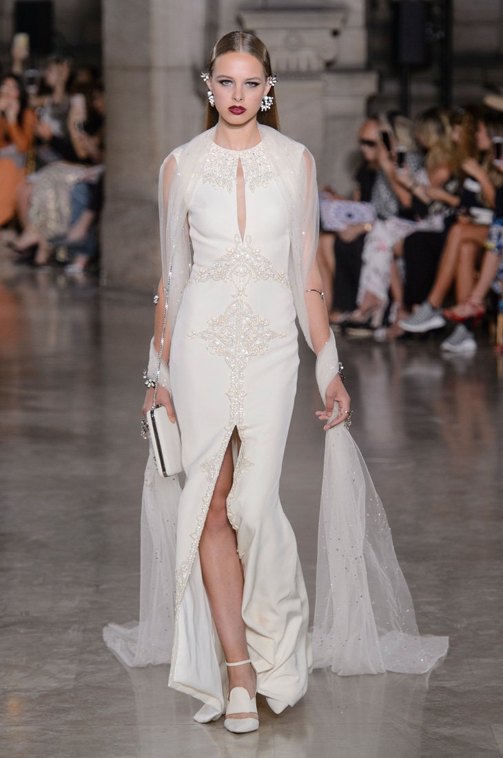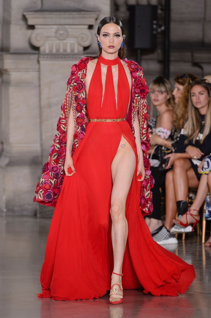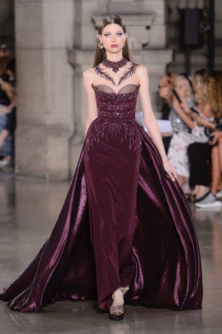 Today, the Lebanese designer Georges Hobeika, who has fashionably made his way to the most elitist Hollywood events, has presented a wave of sumptuous gowns, worthy of his irreverent taste. The show started out as angelic as ever, what with the all-white dresses and the pinkish overall slowly drifting into a billowing cape. Models strutted down the runway in thigh-high gowns, playfully revealing a series of jewel-toned numbers- all of which were carefully bedazzled with oriental embroideries. And then slowly- but surely- the collection turned seductively darker, revealing velvet capes mixed with heart-shaped gowns, brocade wrap dresses and burgundy lamé gowns with statement necklaces and earrings.