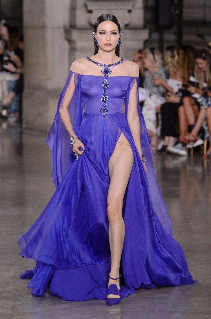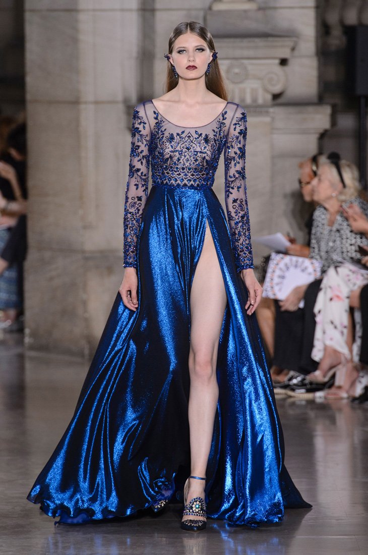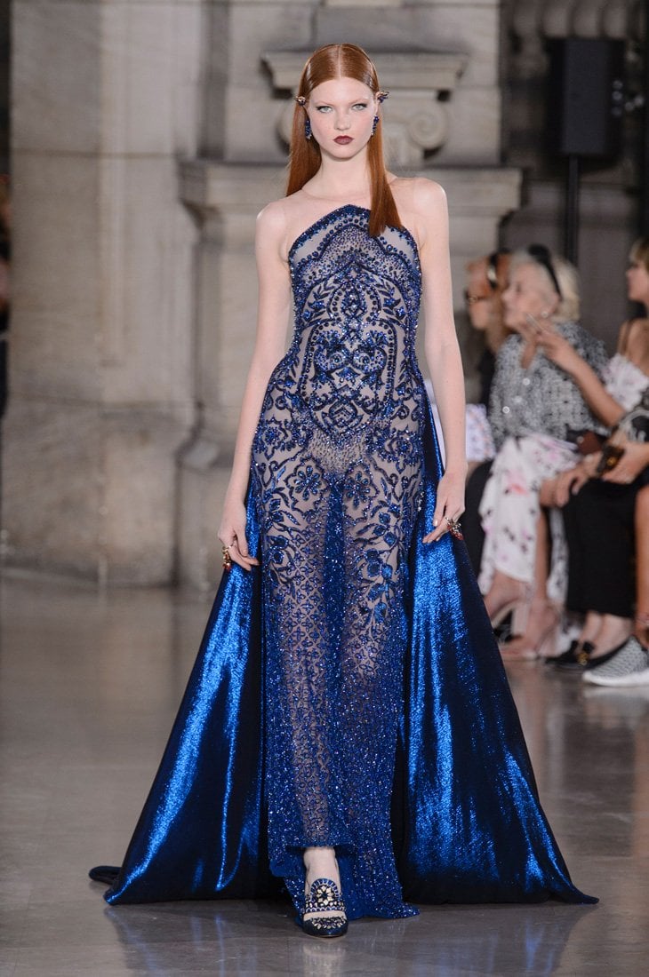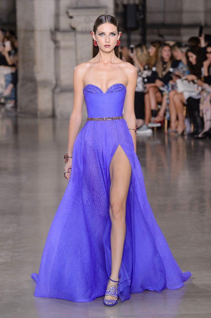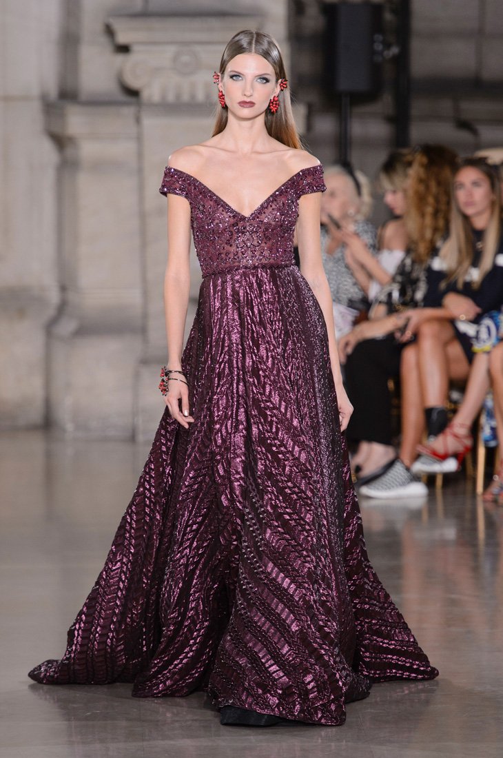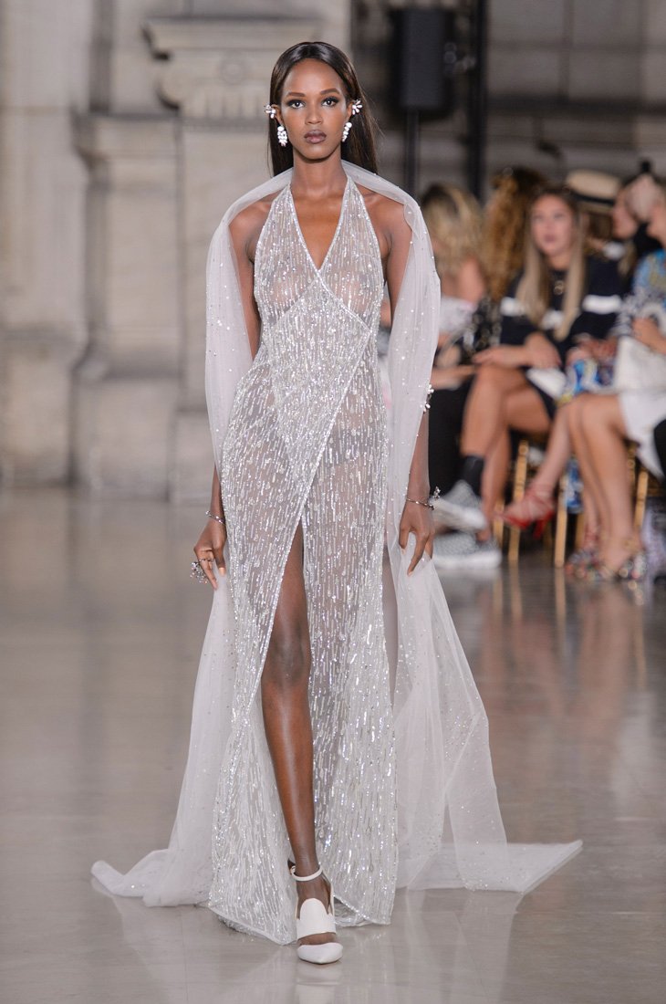 Today, the Lebanese designer Georges Hobeika, who has fashionably made his way to the most elitist Hollywood events, has presented a wave of sumptuous gowns, worthy of his irreverent taste. The show started out as angelic as ever, what with the all-white dresses and the pinkish overall slowly drifting into a billowing cape. Models strutted down the runway in thigh-high gowns, playfully revealing a series of jewel-toned numbers- all of which were carefully bedazzled with oriental embroideries. And then slowly- but surely- the collection turned seductively darker, revealing velvet capes mixed with heart-shaped gowns, brocade wrap dresses and burgundy lamé gowns with statement necklaces and earrings.
