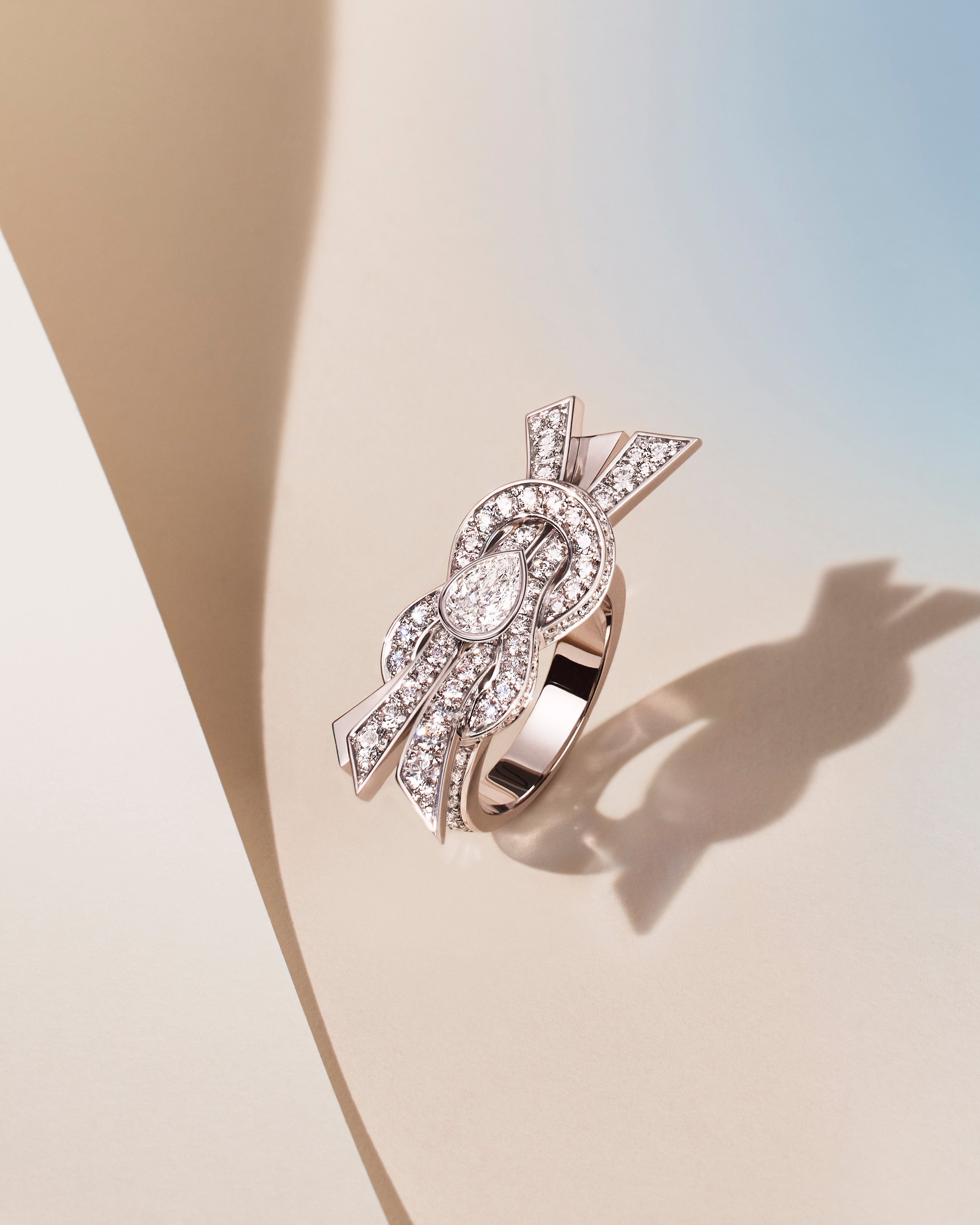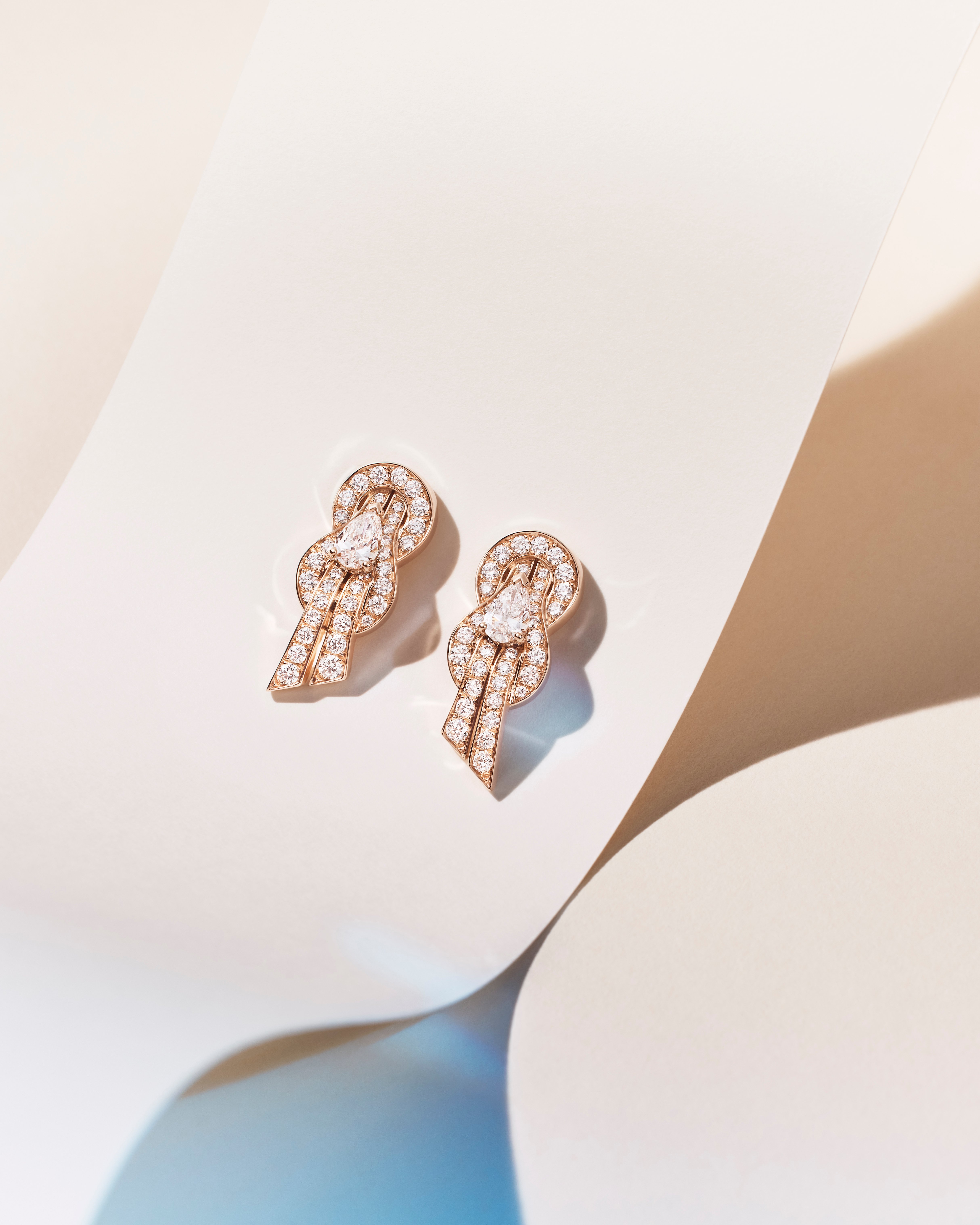 Three High Jewelry pieces, a necklace, ring, and earrings, in white gold feature pavé-set diamonds and a central 0.7 carat pear-shaped diamond. Along come six additional jewelry pieces in white or pink gold, ranging from necklaces to rings and earrings, mirroring the iconic motif, worn either as an 8 or infinity symbol.