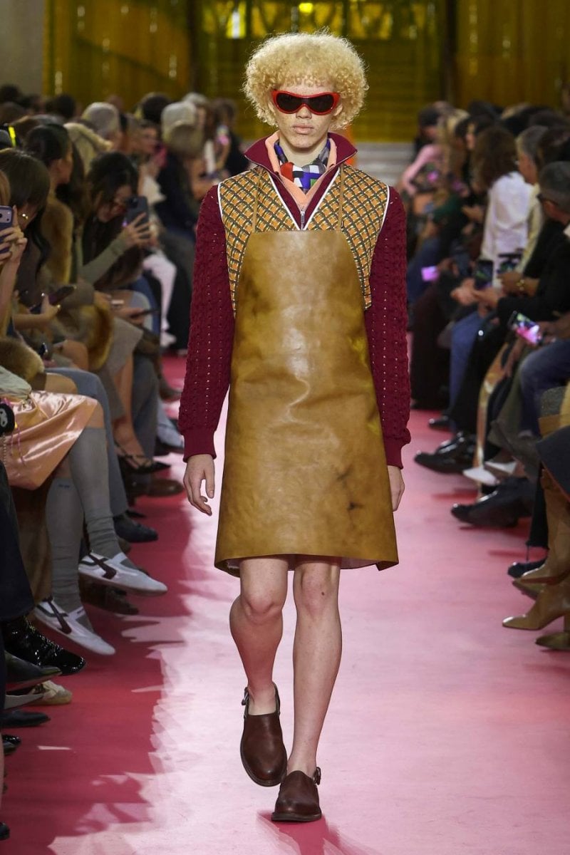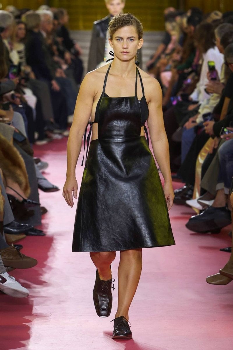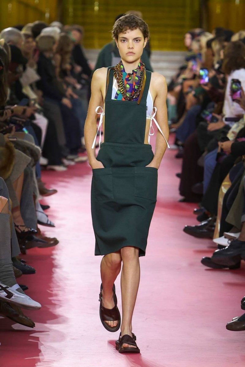 The apron, as a universal symbol of work, takes on new meaning. Functional yet decorative, it shifts across contexts, from domestic to clinical to industrial, embodying both care and strength. Rather than florals or stripes, most aprons and dresses were patterned with small circular motifs that took over the collection with an unprecedented vibe. In turn, materials like industrial drill, leather, cotton poplin, silk cloqué, lace, and raw embroidered canvas ground the collection in tactile authenticity. As for the accessories in robust leathers, they emphasize utility and industrial beauty, while ruffles add a delicate yet subversive twist.