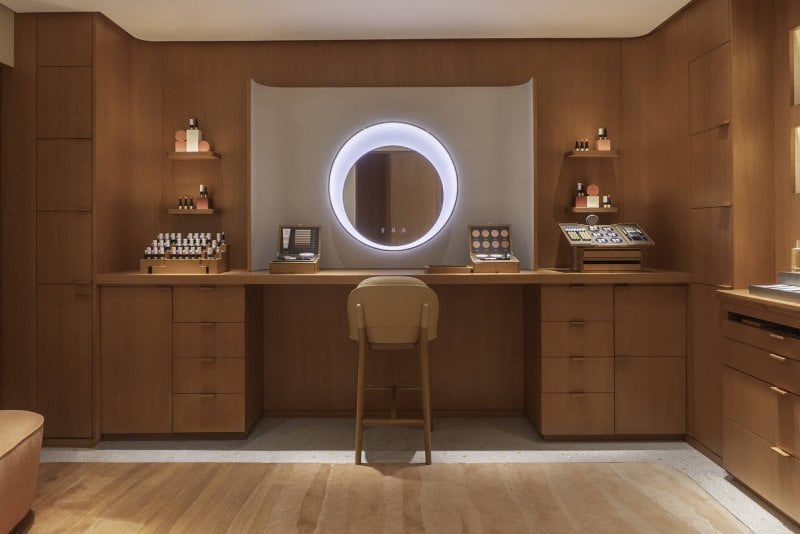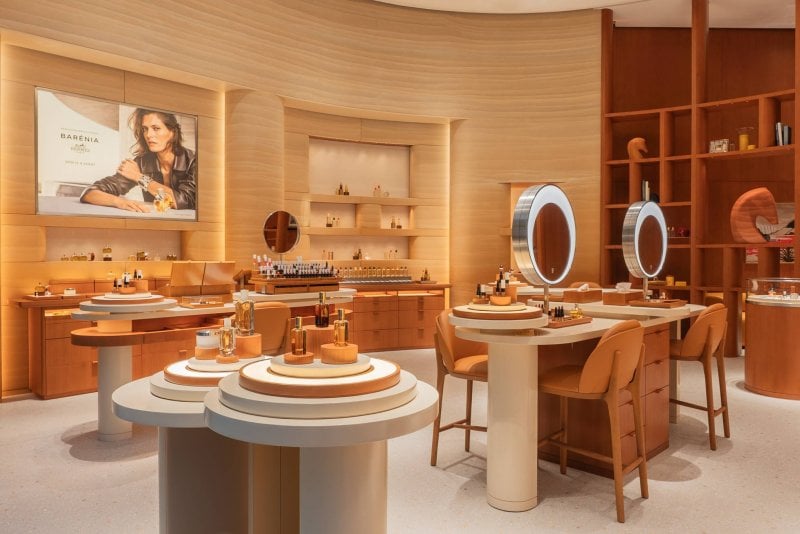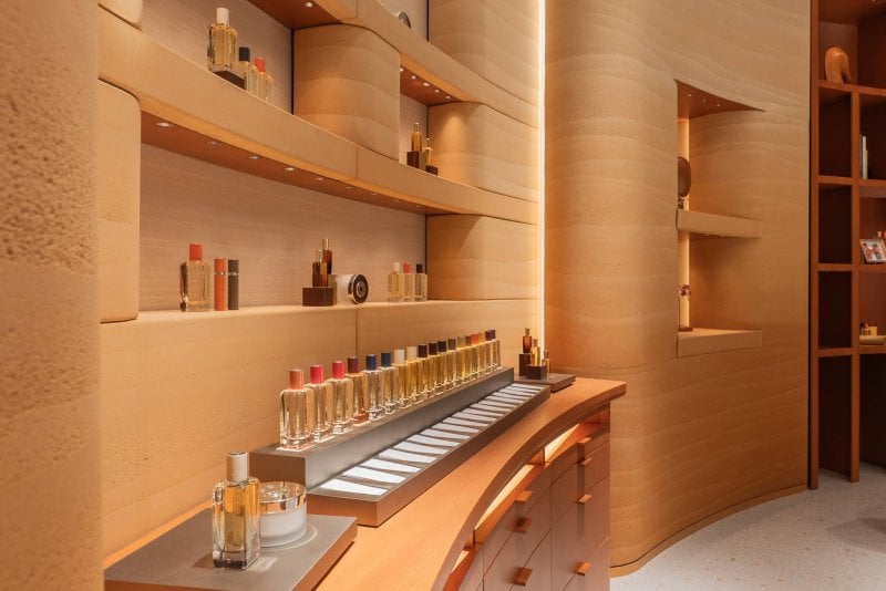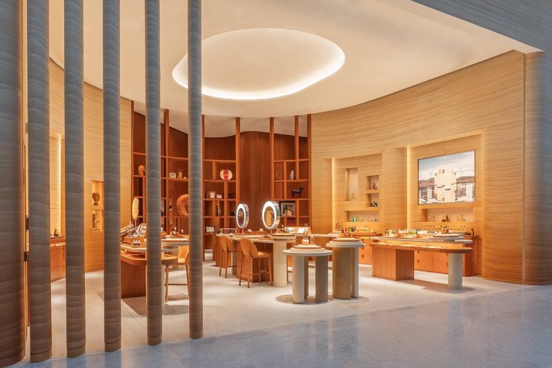Inspired by the region’s ancient desert landscapes, the store’s rammed-earth façade, crafted from Arabian sand and earth, flows into an elegant interior of ochre tones, Sienna marble, and mother-of-pearl terrazzo. Designed by Paris-based RDAI agency, the boutique features two private VIC rooms, beauty consultation counters, and curated artworks from the Émile Hermès Collection, including engravings by Alfred de Dreux and illustrations by Sanaé Nicolas.