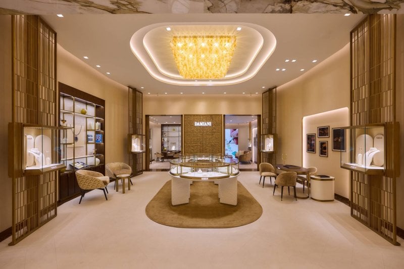 The Dubai boutique now spans 177 sqm, while the new Bahrain space covers 150 sqm, both reflecting Damiani’s new global concept – an elegant blend of Italian craftsmanship and contemporary design. Inspired by the atmosphere of a refined Italian home, the boutiques feature soft, rounded furnishings, warm tones of gold, beige, and brown, and exclusive VIP rooms offering a private, welcoming experience. Highlights include a Venini Poliedri chandelier crafted from amber-colored blown glass and a custom Venini wall installation in Dubai, symbolizing the Maison’s artistic heritage.