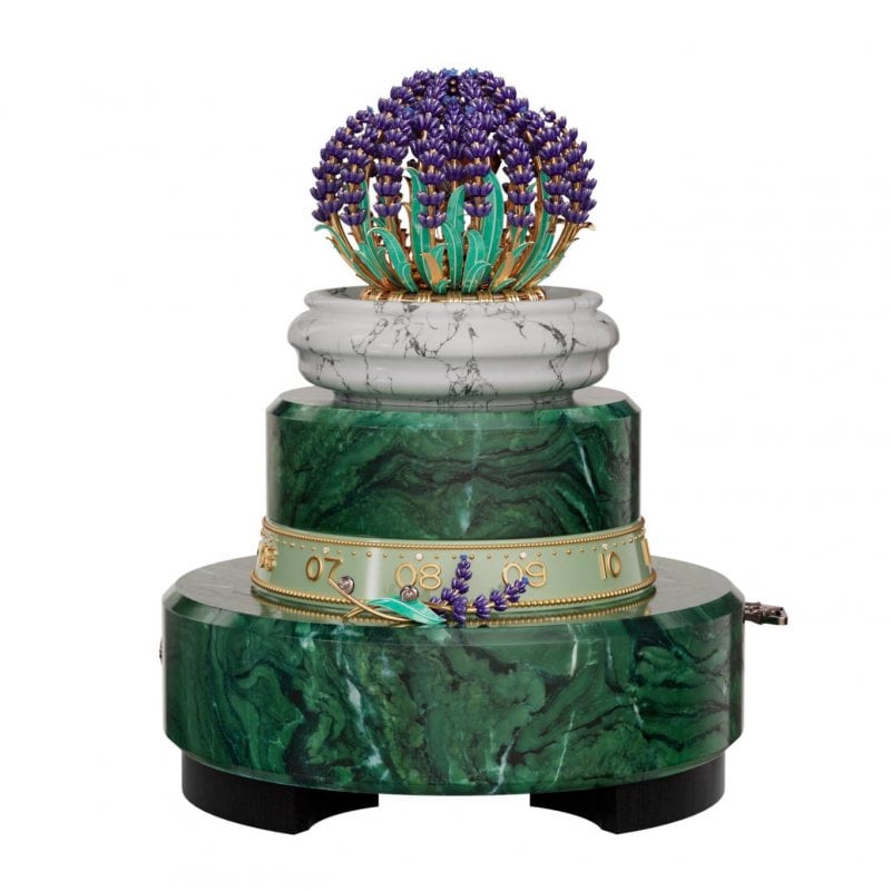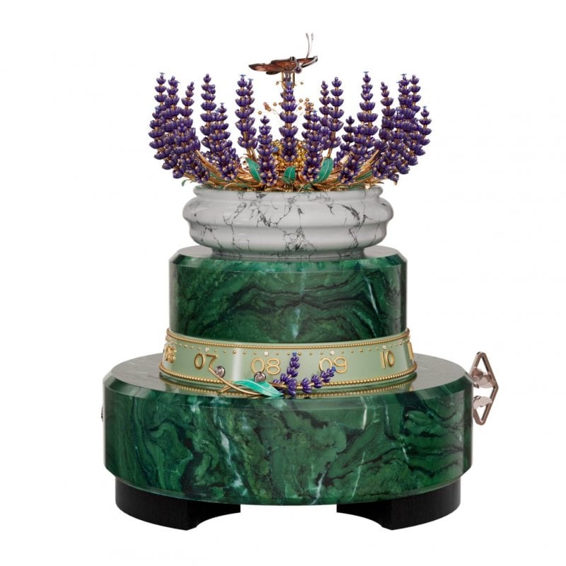 The Brassée de Lavande Automaton, assembled in the Mécanique d’Art Workshop in Sainte-Croix, is a tribute to nature’s grace, combining movement, music, and fine craftsmanship. Standing approximately 12 inches tall, the automaton features thirty-six lacquered rose gold lavender stems forming a delicate dome. When activated, the bouquet opens to reveal a butterfly with wings of orange plique-à-jour enamel, diamonds, and black enamel outlines. Crafted from tiger’s eye and amethyst, the butterfly flutters gracefully before returning to the bouquet’s heart as it gently closes. The automaton’s base, composed of verdite, howlite, and polished white gold snails, incorporates a rotating ring that displays the time with golden beads and diamond hour markers. When in motion, the scene is accompanied by a harmonious melody.
