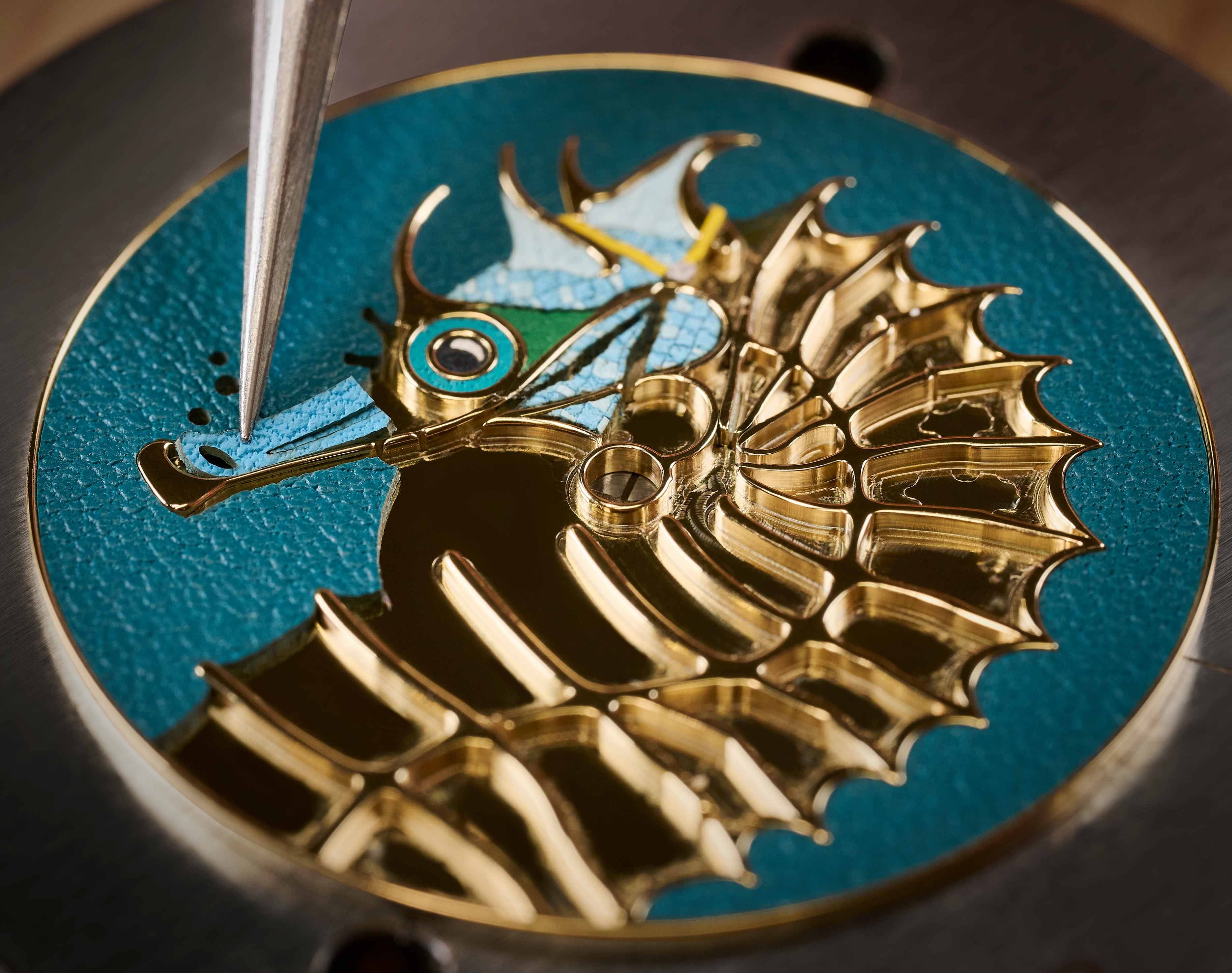 Issued in numbered limited series of 24 each, the dials showcase fragments of 0.5 mm leather meticulously cut and assembled to form vivid mosaics. The engraver first traces the seahorse’s contours before marquetry adds color and depth, allowing the creature to emerge in remarkable detail, for a truly refined artisanal tribute timepiece.