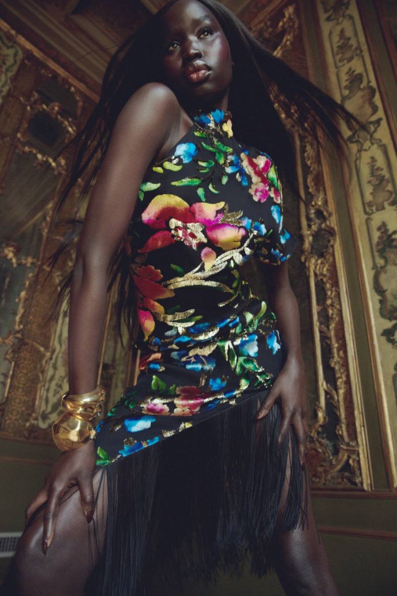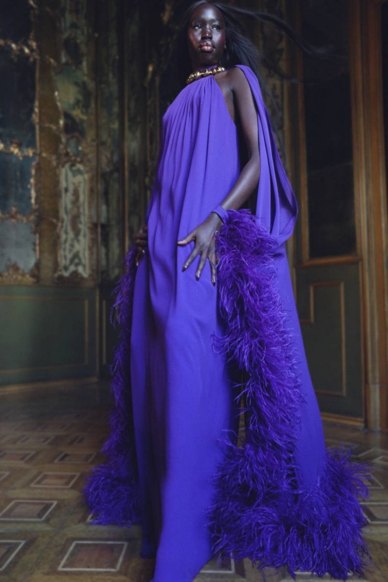 The palette is bold and saturated, featuring deep ruby red, intense violet, vivid chartreuse, and dark liquorice black. Luxurious fabrics – from multicolored floral velvet to silk, viscose velvets, crepe chiffon, metallic organza jacquard, and sequined textiles – create a tactile feast. Ostrich feathers and tonal fringes accent kaftans and gowns, while micro lengths, open backs, daring slits, and crystal-buckled kaftans add contemporary sensuality.