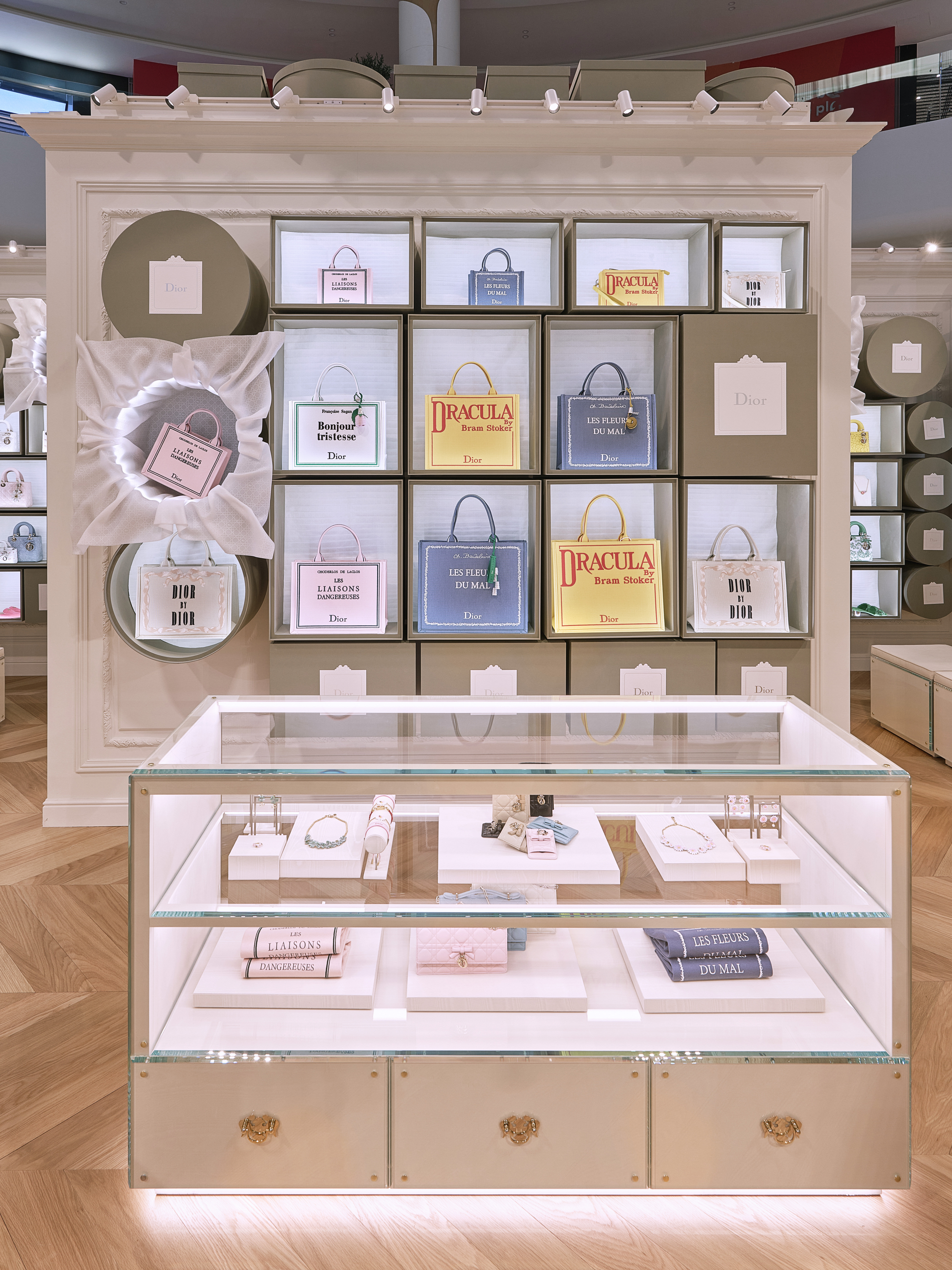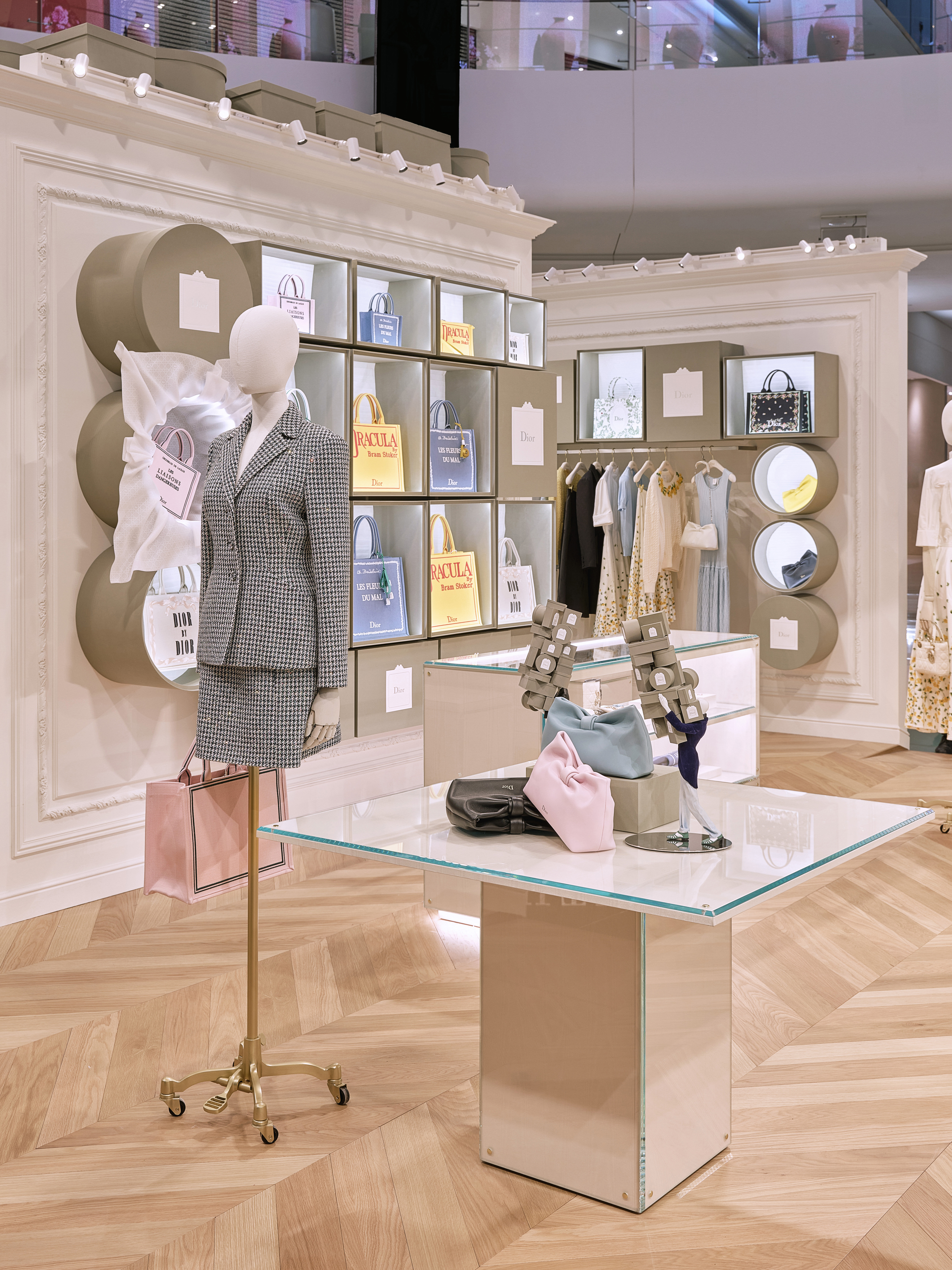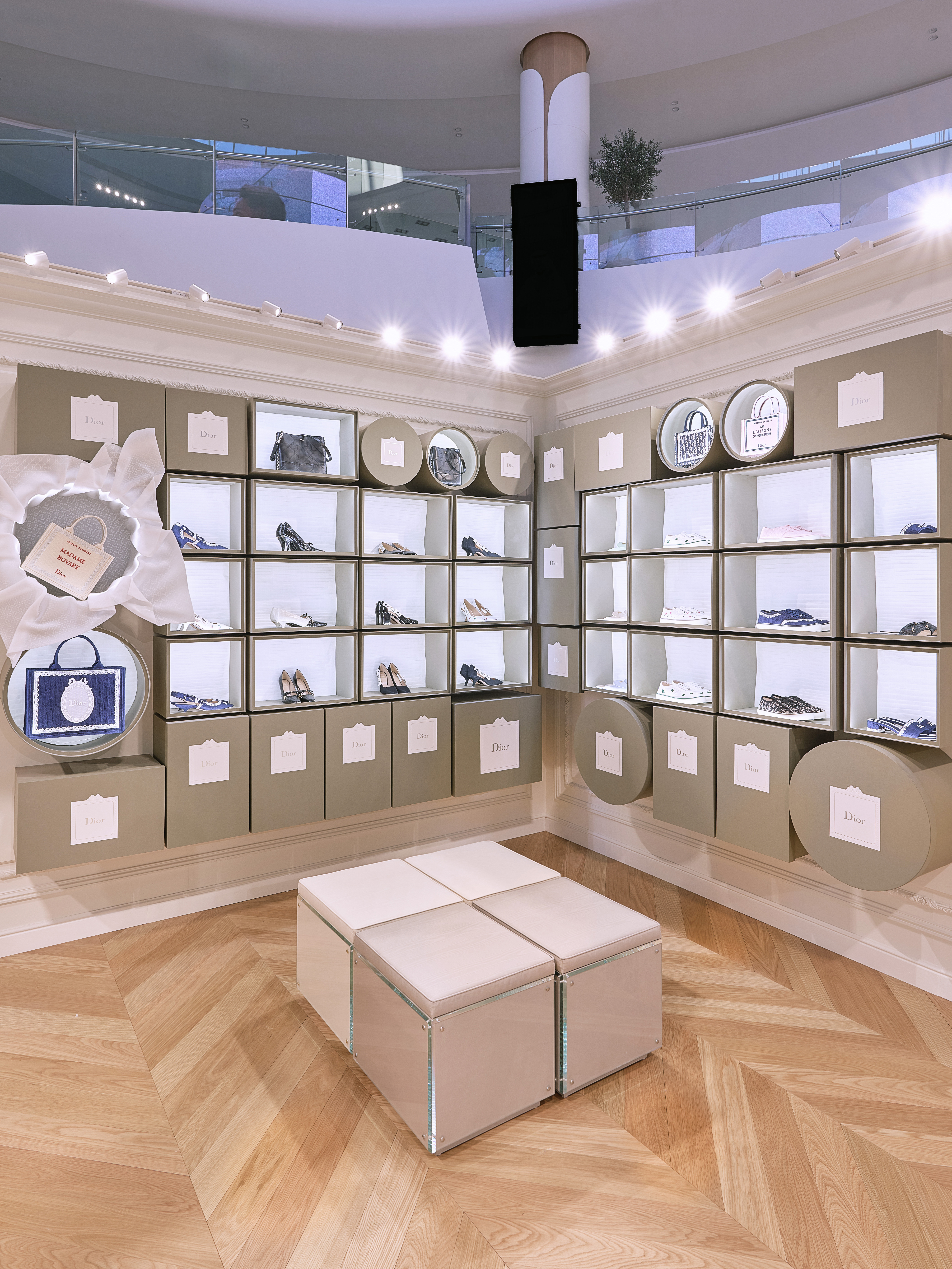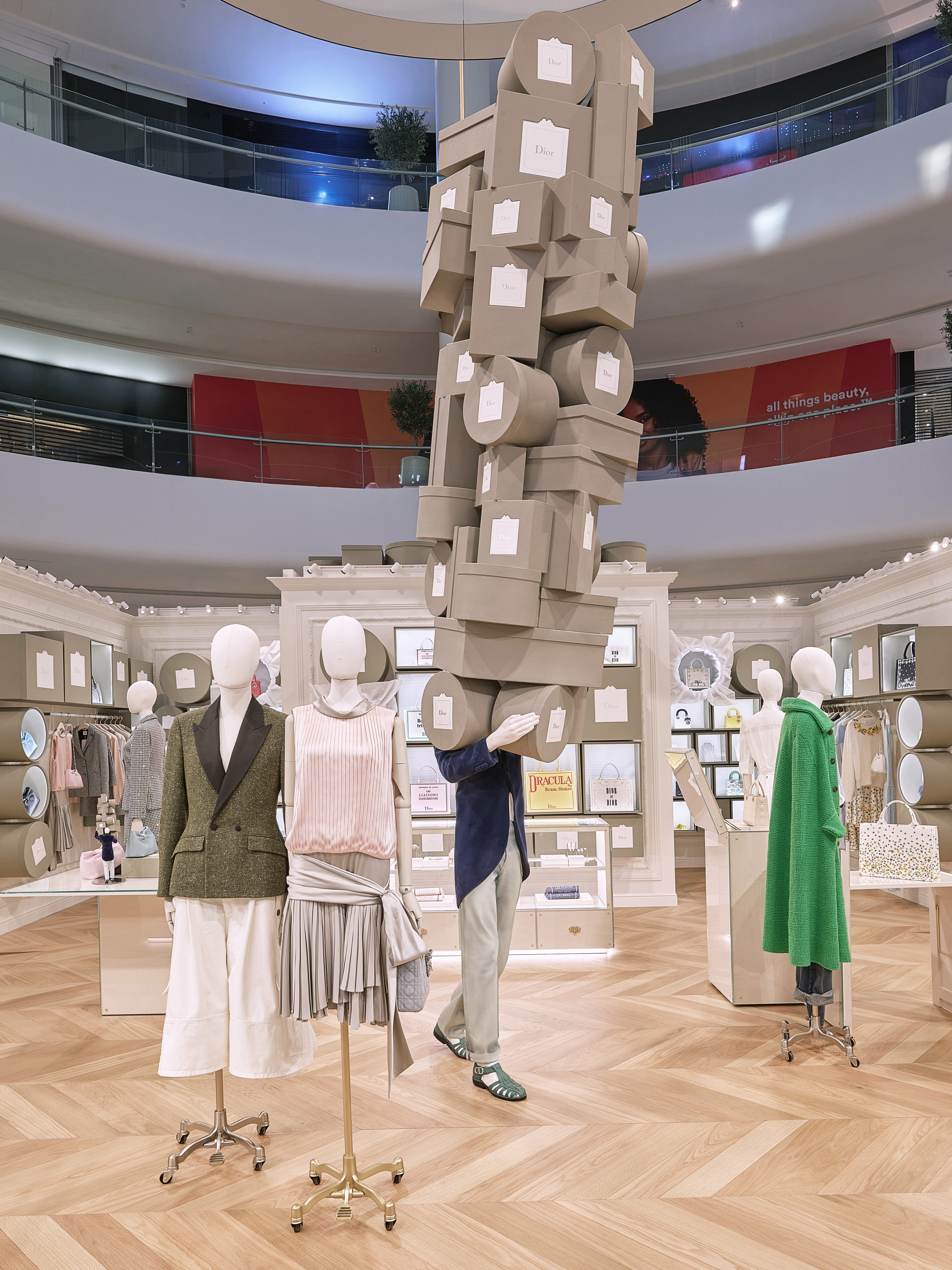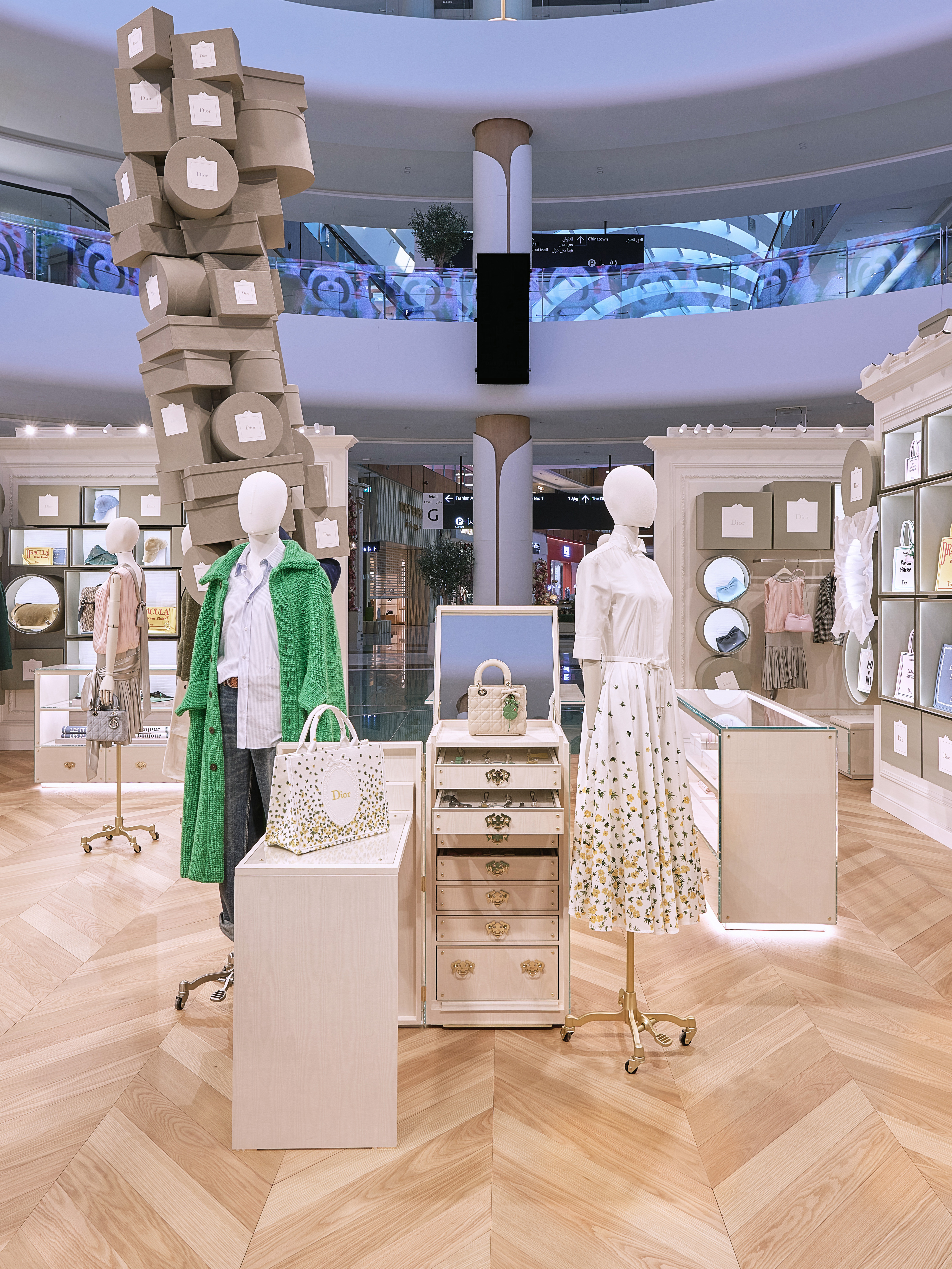 To celebrate the arrival of Jonathan Anderson’s collections for Dior, the House unveils a unique pop-up store at Dubai Mall. Immersive scenography reinterprets the iconic boxes from Dior’s first boutique, Colifichets, in a playful homage to the signature gray of 30 Montaigne and the precious cases housing the archives. Towering stacks of boxes fill the central space, spilling from shelves or forming off-kilter towers carried by mischievous bellboys that seem to defy gravity.