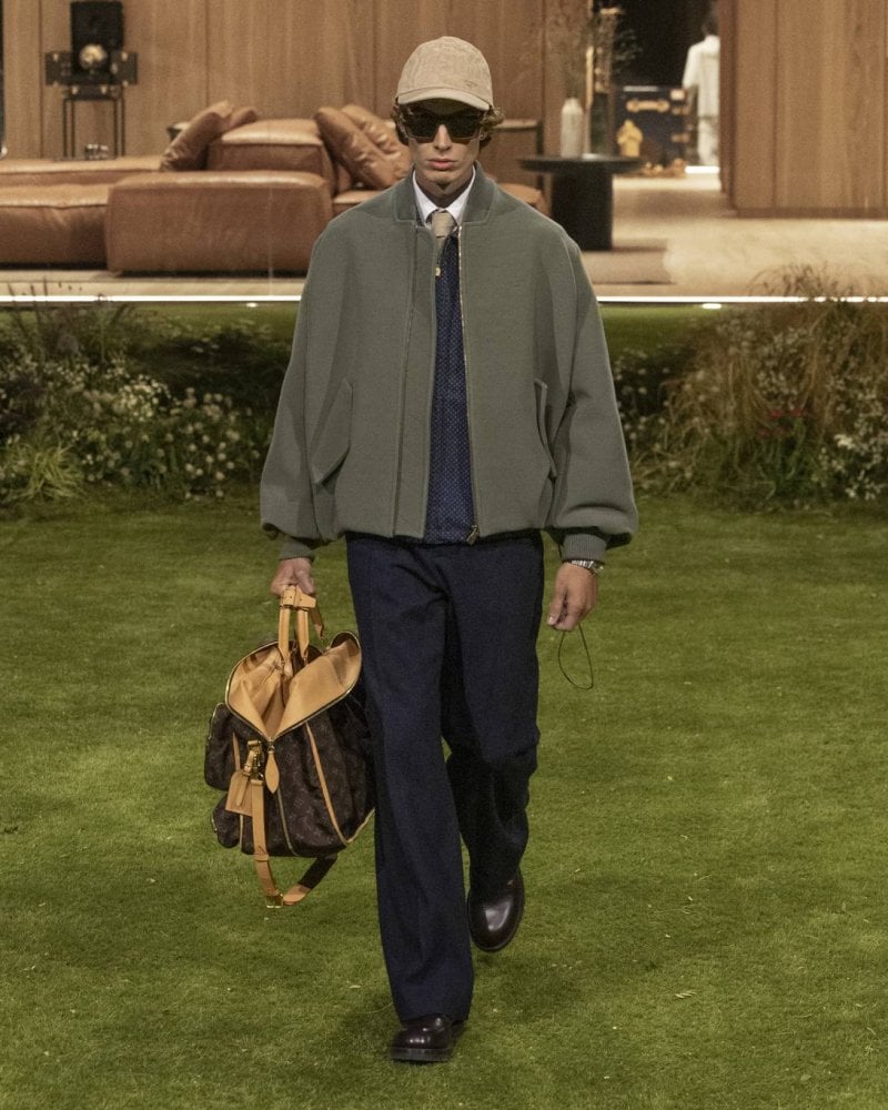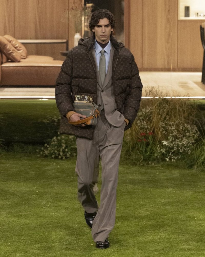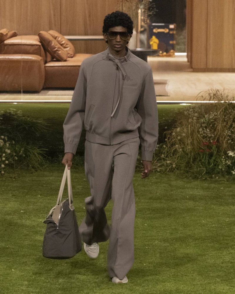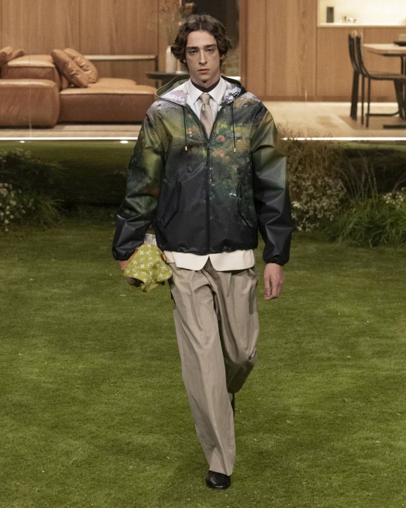 At the heart of the show stood the DROPHAUS, a prefabricated home designed by Pharrell Williams in collaboration with Not A Hotel. Installed within a lush garden, the structure echoed the collection’s central droplet motif and set the stage for silhouettes rooted in classic menswear, reimagined with relaxed volumes and retro-futuristic elegance inspired by 1980s visions of the future. Trompe l’oeil effects transformed luxurious materials into deceptively casual forms, while droplet motifs appeared across ready-to-wear, accessories and the new LV Drop sneaker.