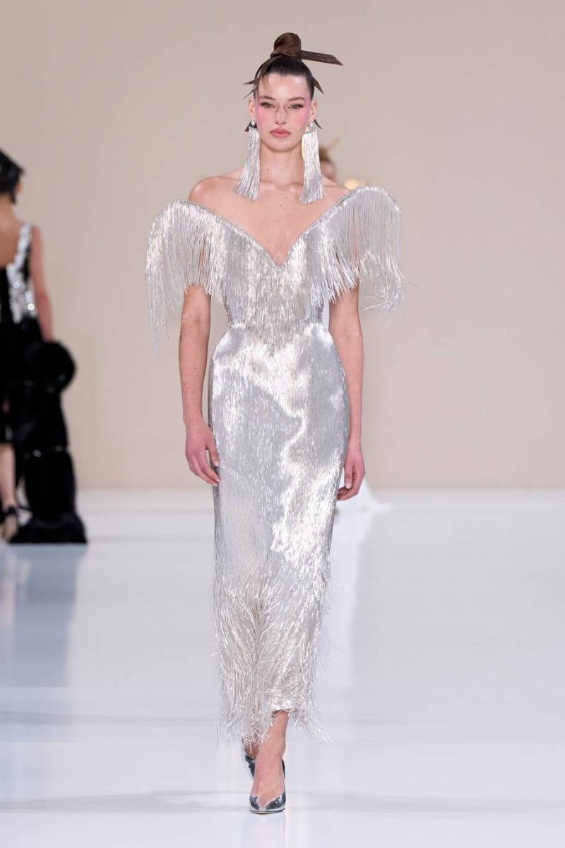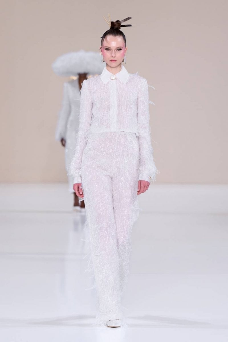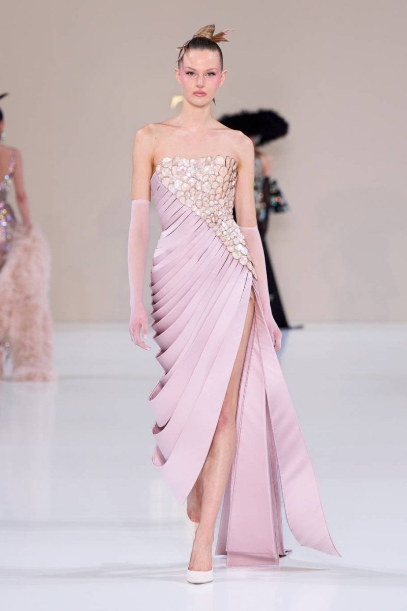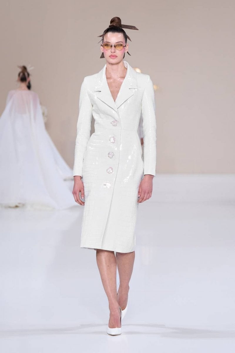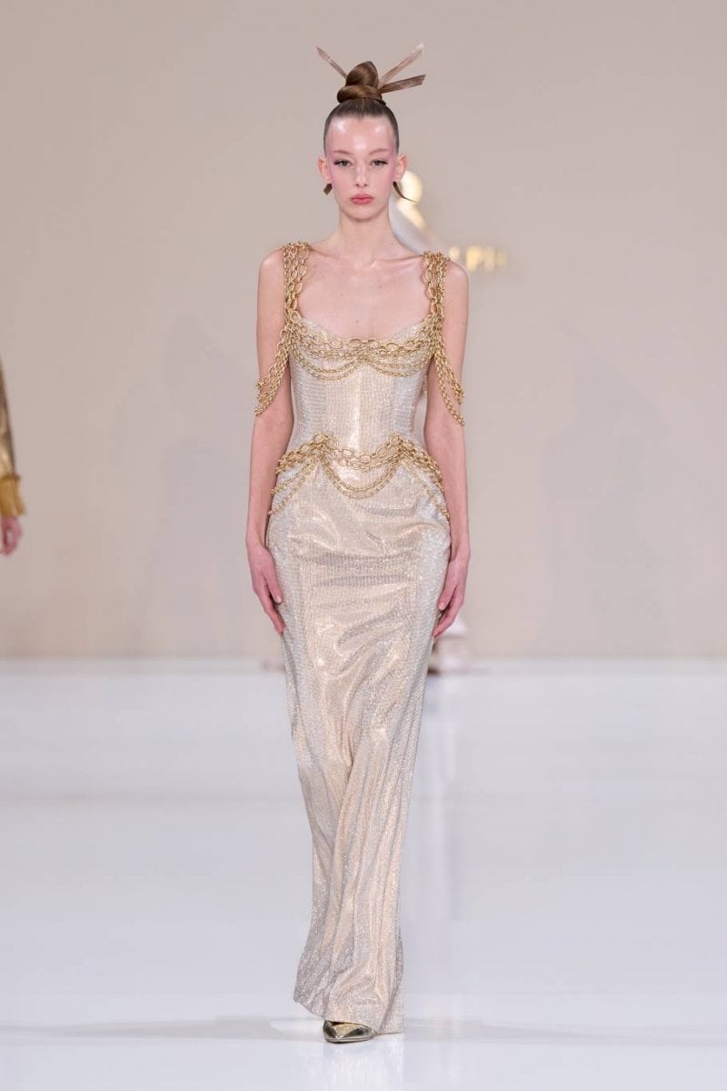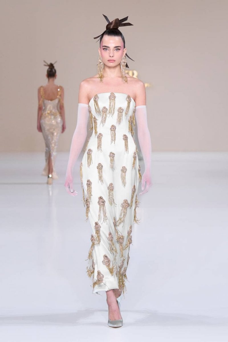 The couture collection, La Lumière Dorée, is an ode to modern elegance shaped by delicate Asian influences and refined couture craftsmanship. Silhouettes draw from the disciplined geometry of origami, where sculpted folds and fluid structures create movement with poetic precision. Light plays a central role, refracted through pearlescent shards, radiant rays and intricate metalwork inspired by peacock feathers, symbolizing beauty, protection and renewal. Materials anchor the story with strength and allure, from immaculate white crocodile to cool mint satin, alongside mother-of-pearl accents, metallic embroidery and gilded golds. Together, they highlight a devotion to tradition and savoir-faire.