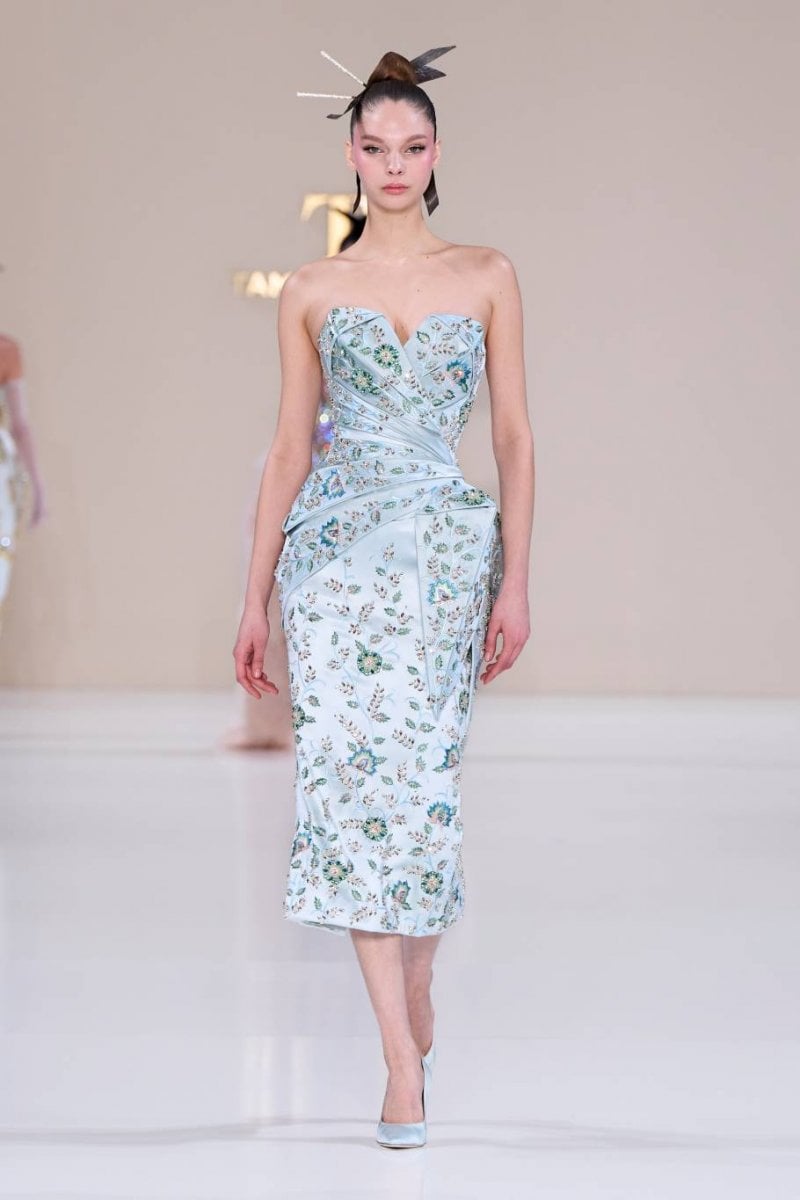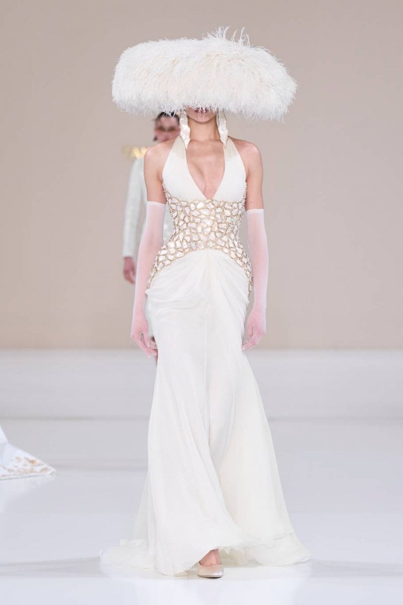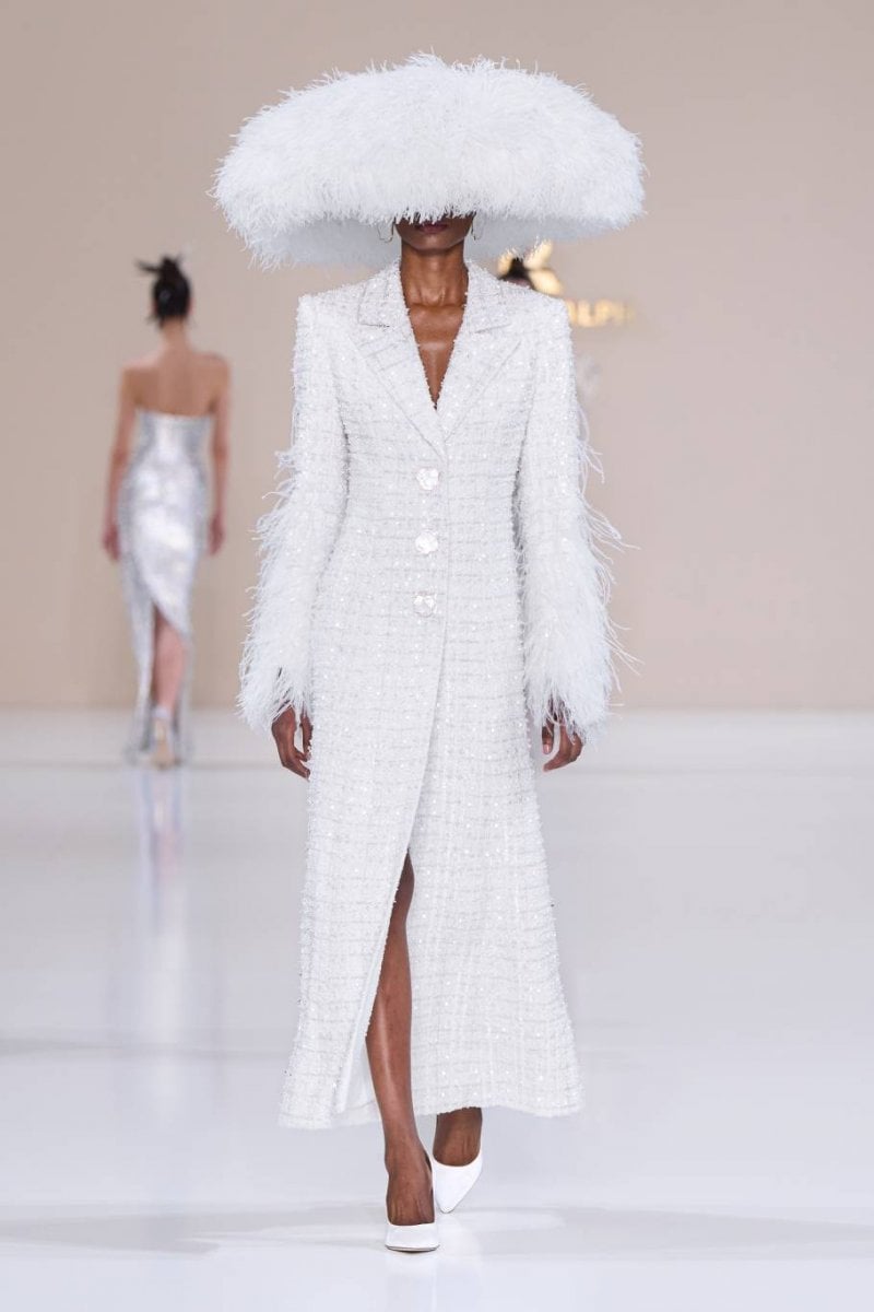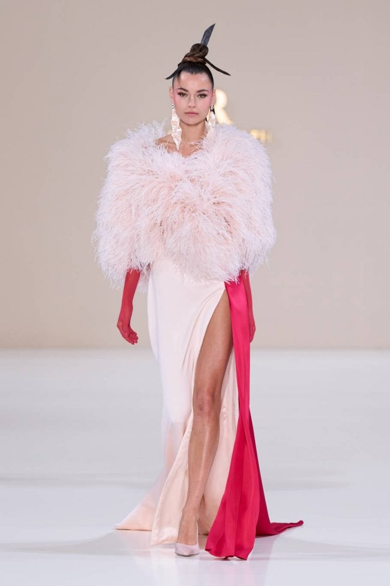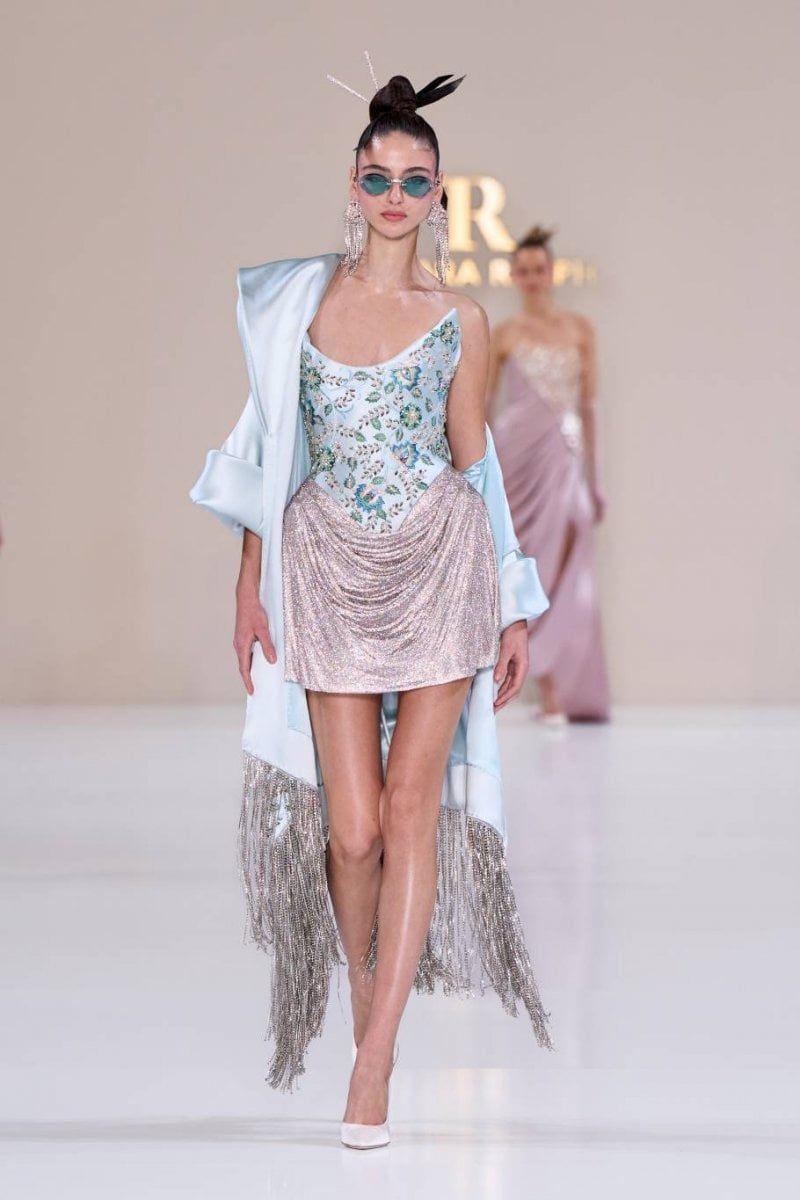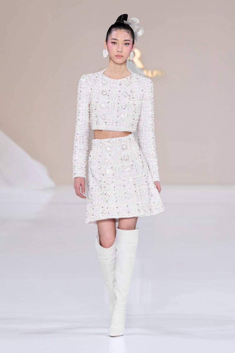 The couture collection, La Lumière Dorée, is an ode to modern elegance shaped by delicate Asian influences and refined couture craftsmanship. Silhouettes draw from the disciplined geometry of origami, where sculpted folds and fluid structures create movement with poetic precision. Light plays a central role, refracted through pearlescent shards, radiant rays and intricate metalwork inspired by peacock feathers, symbolizing beauty, protection and renewal. Materials anchor the story with strength and allure, from immaculate white crocodile to cool mint satin, alongside mother-of-pearl accents, metallic embroidery and gilded golds. Together, they highlight a devotion to tradition and savoir-faire.