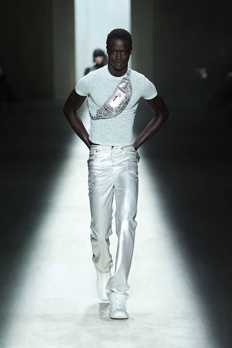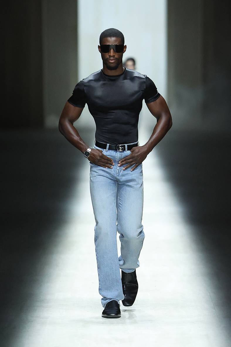 References to Renaissance statuary emerged in sculpted Adonis silhouettes and Grecian drapes, balanced by daring eveningwear: slashed gowns, embellished sets worn barefoot, and a backless finale revealing a diamond-studded white gold thong.