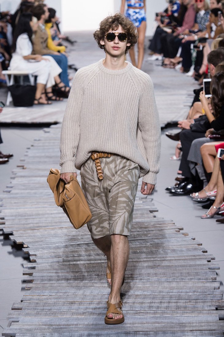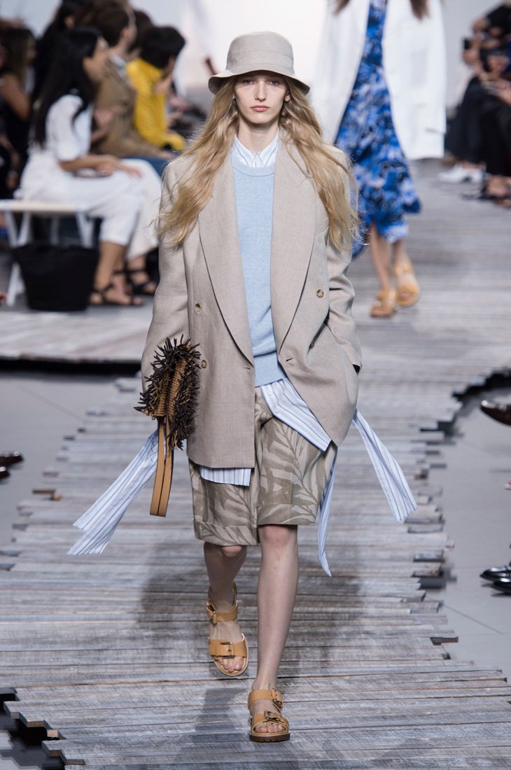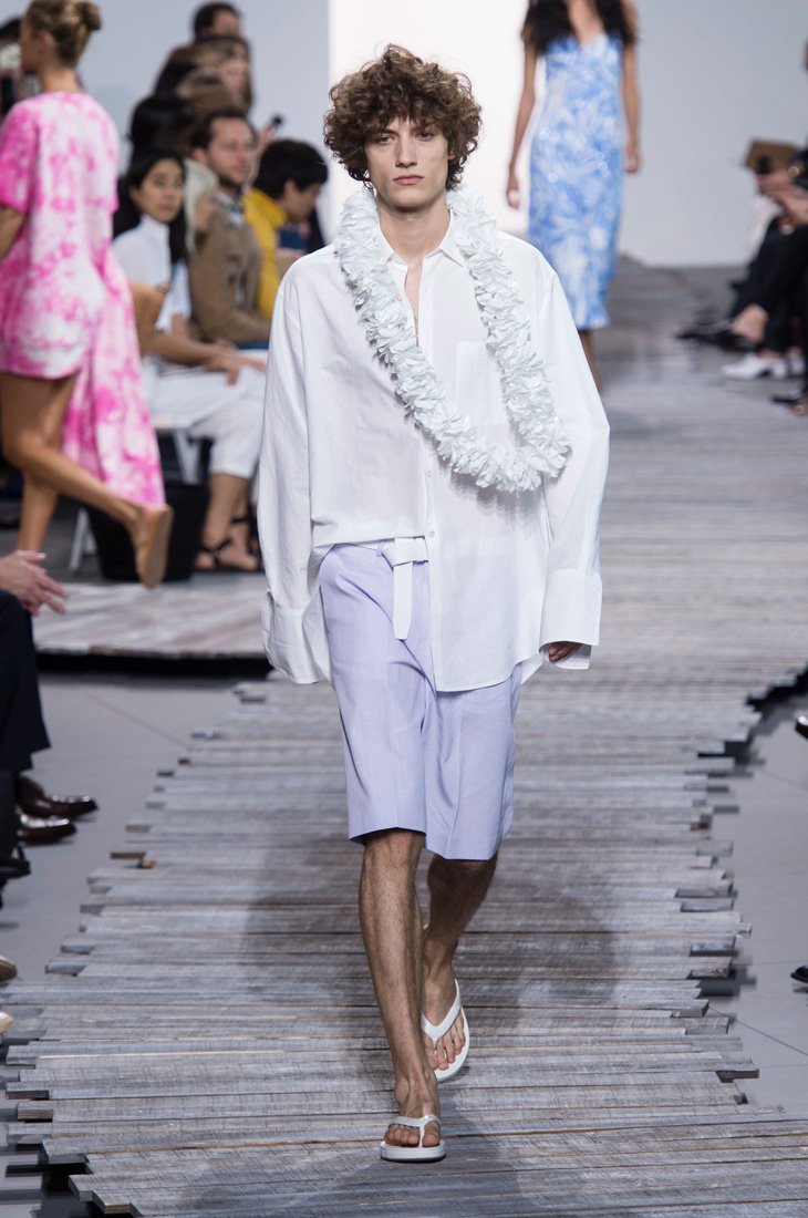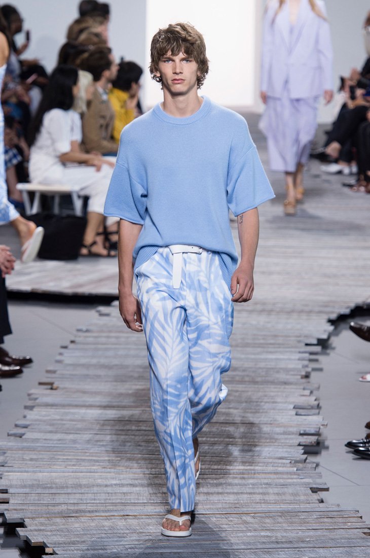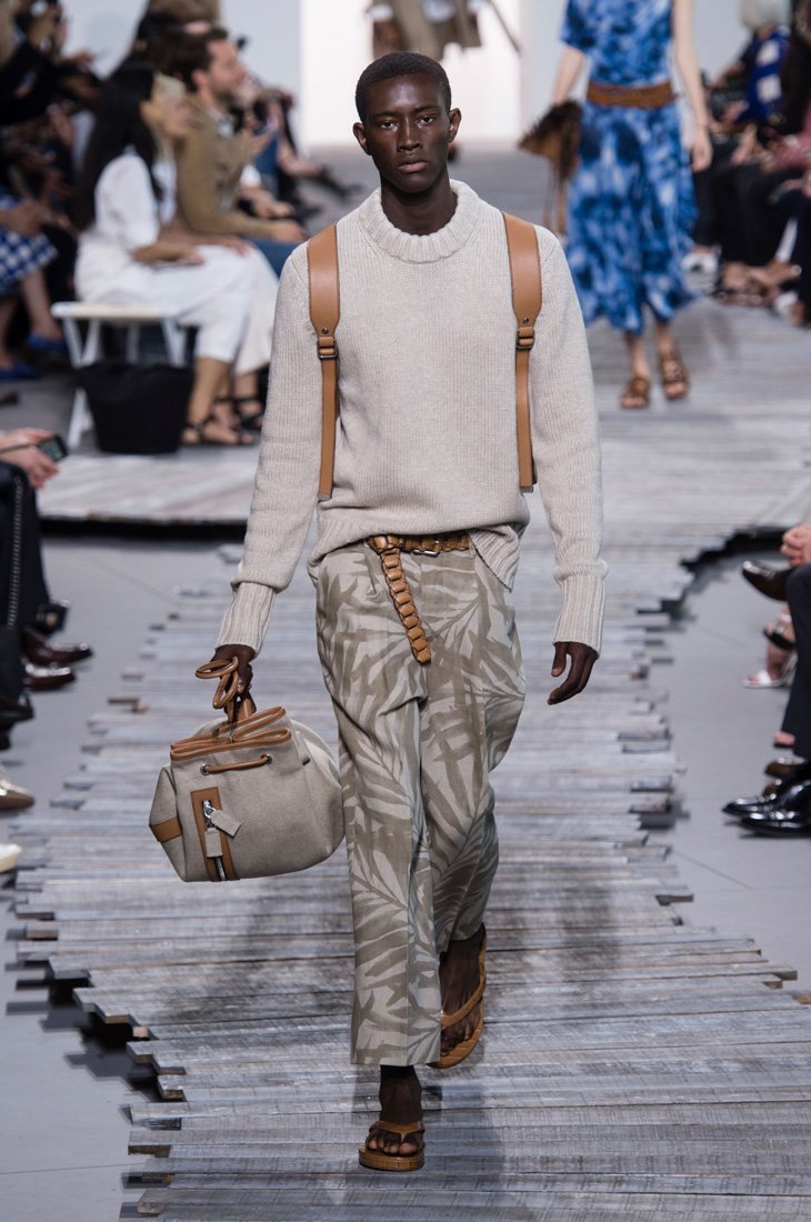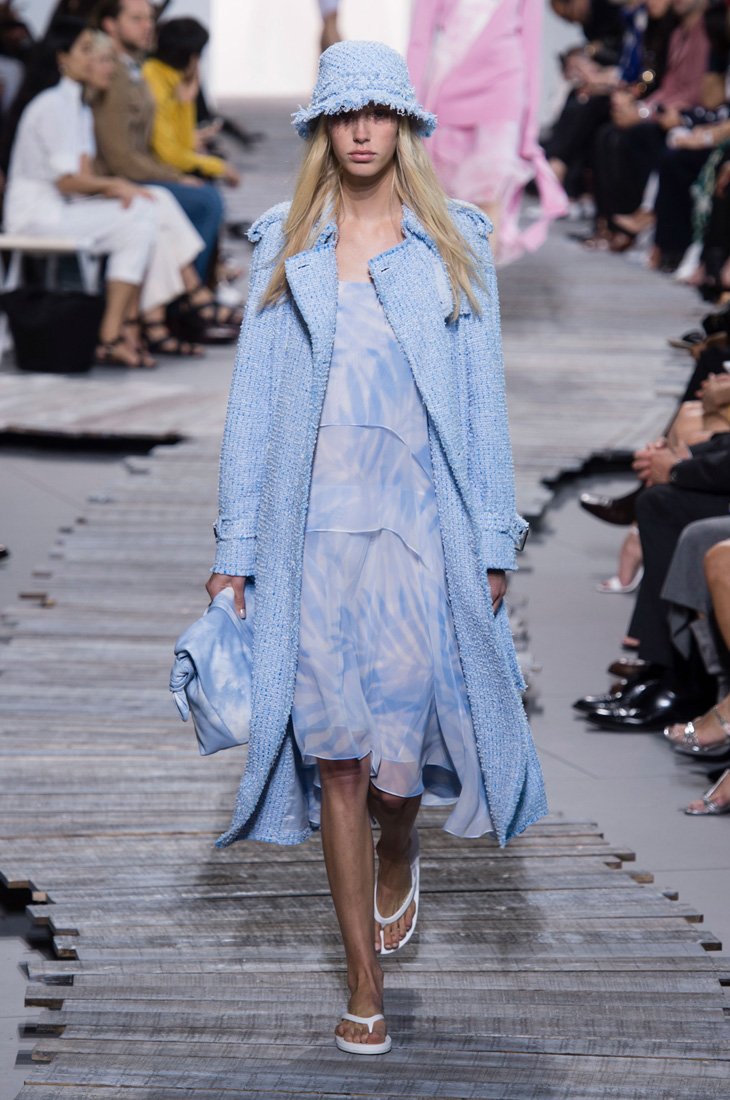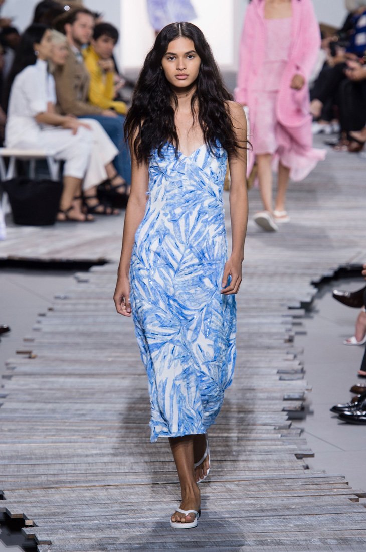 The leggy models sashayed onto the runway in a Hawaiian-chic kind of clothing – think Aloha sweats, fresh large trousers and one big scarf-necklace that could have doubled as a Hawaiian insignia. Even the lightweight coats featured a leafy pattern, heading towards a garden-fresh vibe with colors skewing from baby blue to white. Maxi pink knits were paired with color-matching light dresses and pinstriped trousers were rendered more summery with a calmer color palette. The models sported tongs at times and heeled sandals at other times, highlighting the calming breeziness of the collection. The clothes shortly turned into sultry floral dresses at times and elegant culottes with straw sandals at other times. The designs were all bracketed with a light continuum of colors, all of which made the collection mood board very clear: the calmer, the better.