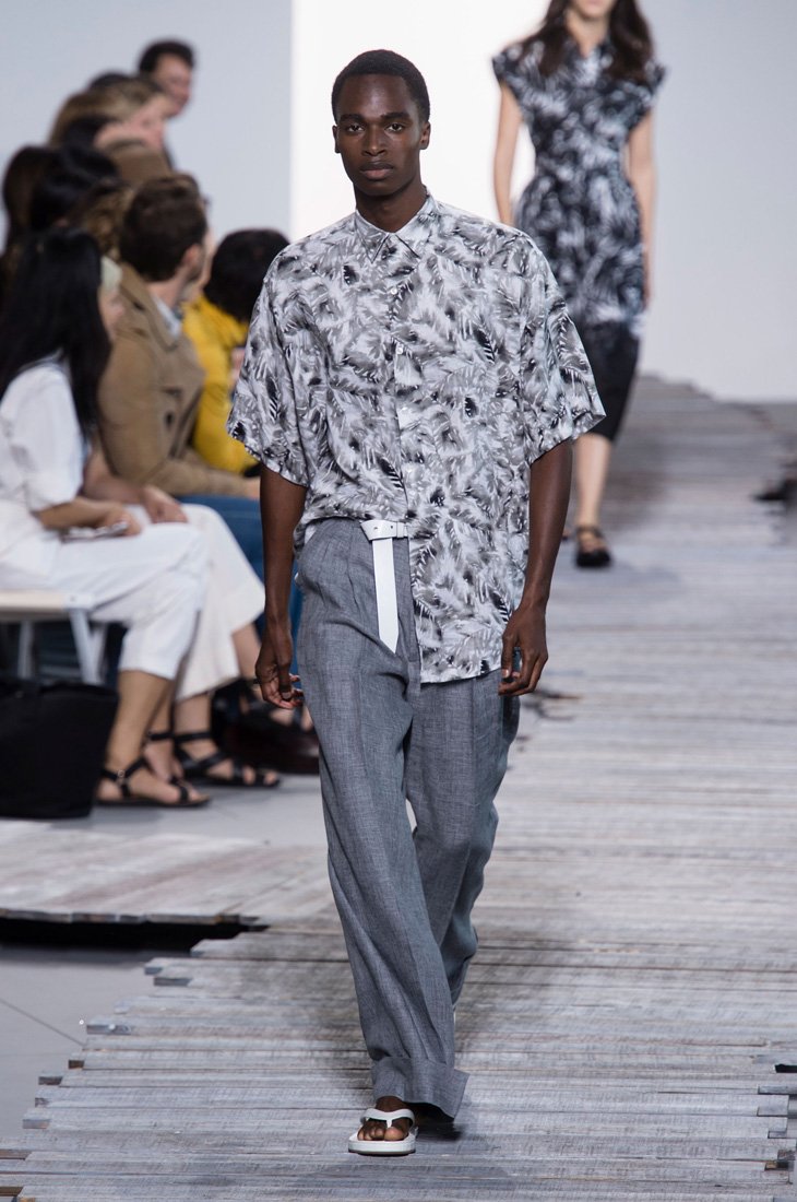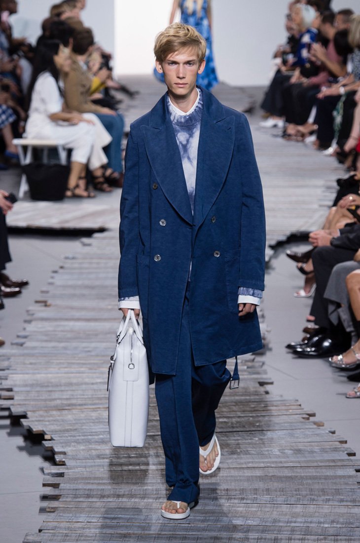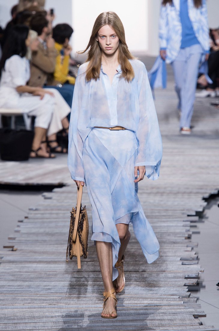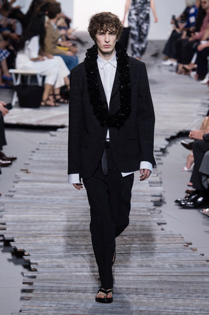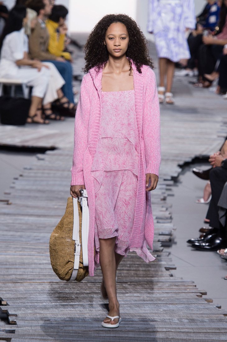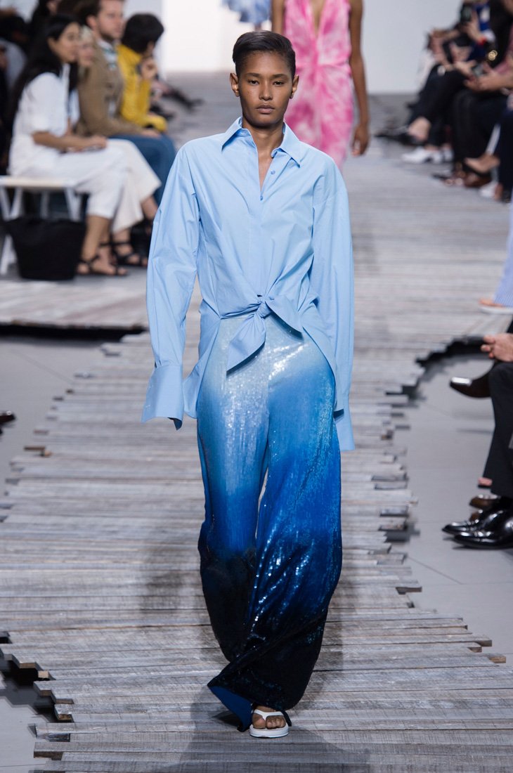The leggy models sashayed onto the runway in a Hawaiian-chic kind of clothing – think Aloha sweats, fresh large trousers and one big scarf-necklace that could have doubled as a Hawaiian insignia. Even the lightweight coats featured a leafy pattern, heading towards a garden-fresh vibe with colors skewing from baby blue to white. Maxi pink knits were paired with color-matching light dresses and pinstriped trousers were rendered more summery with a calmer color palette. The models sported tongs at times and heeled sandals at other times, highlighting the calming breeziness of the collection. The clothes shortly turned into sultry floral dresses at times and elegant culottes with straw sandals at other times. The designs were all bracketed with a light continuum of colors, all of which made the collection mood board very clear: the calmer, the better.
