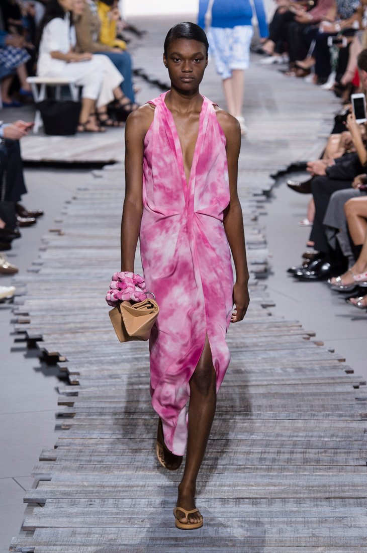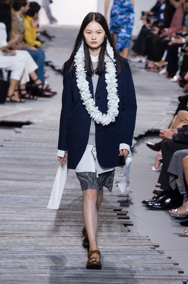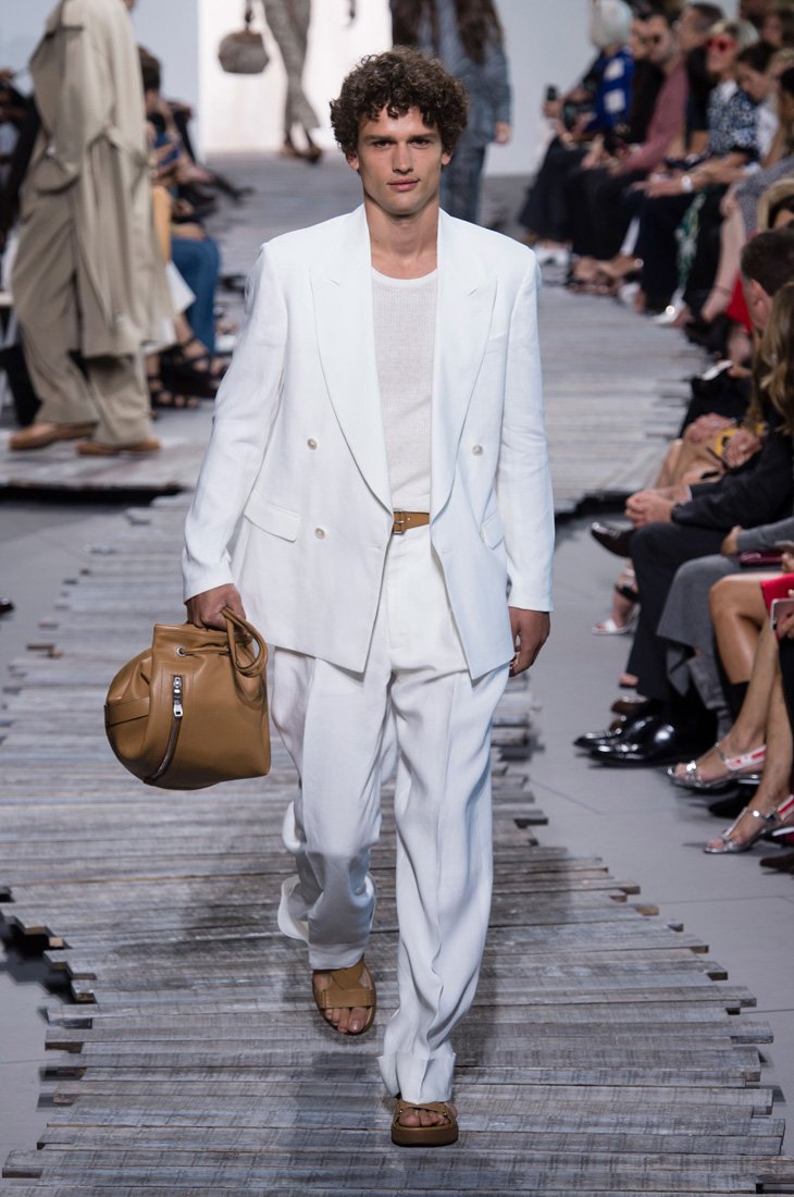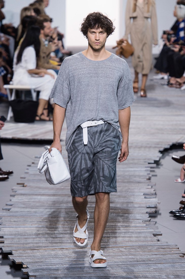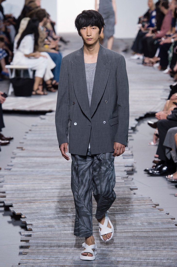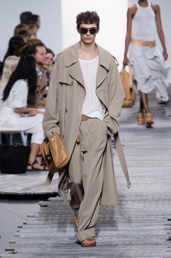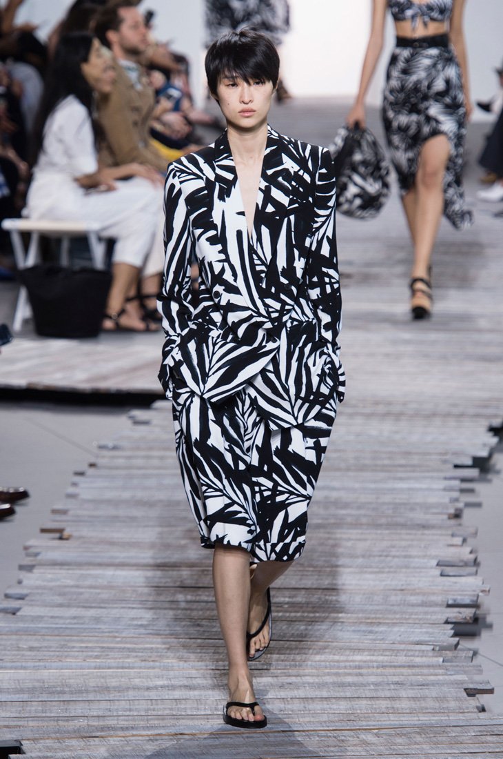 The leggy models sashayed onto the runway in a Hawaiian-chic kind of clothing – think Aloha sweats, fresh large trousers and one big scarf-necklace that could have doubled as a Hawaiian insignia. Even the lightweight coats featured a leafy pattern, heading towards a garden-fresh vibe with colors skewing from baby blue to white. Maxi pink knits were paired with color-matching light dresses and pinstriped trousers were rendered more summery with a calmer color palette. The models sported tongs at times and heeled sandals at other times, highlighting the calming breeziness of the collection. The clothes shortly turned into sultry floral dresses at times and elegant culottes with straw sandals at other times. The designs were all bracketed with a light continuum of colors, all of which made the collection mood board very clear: the calmer, the better.