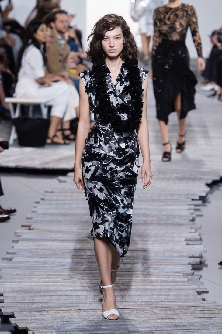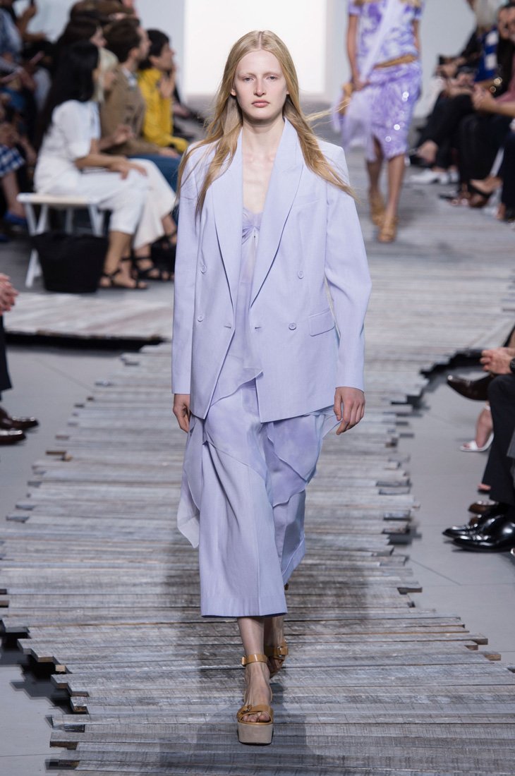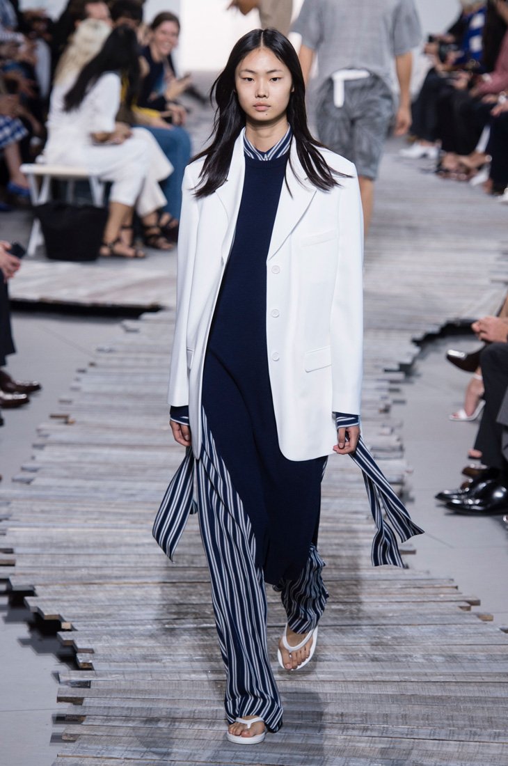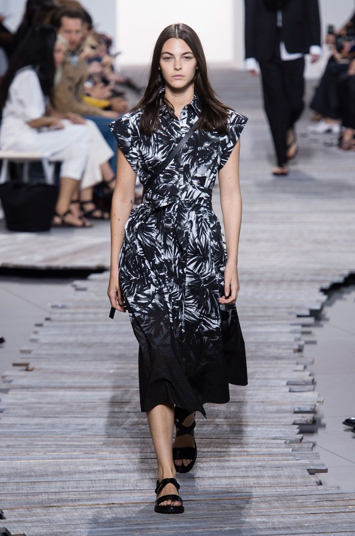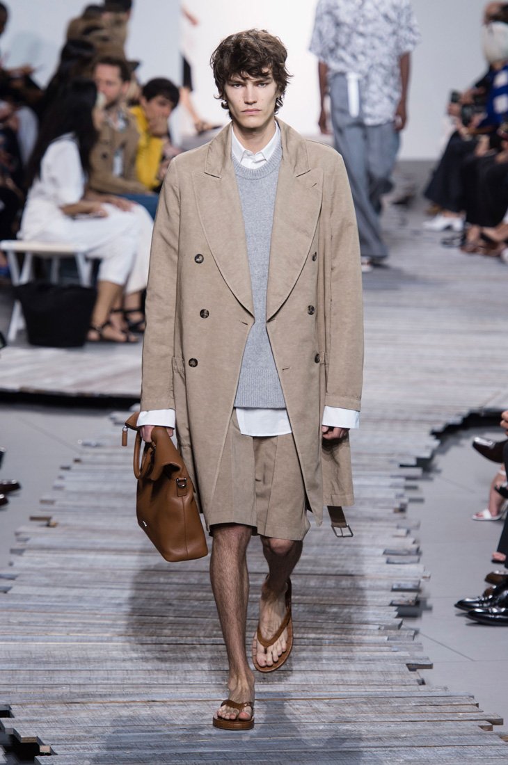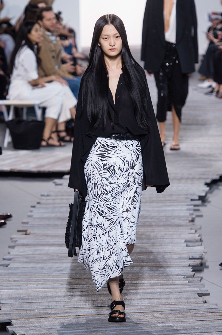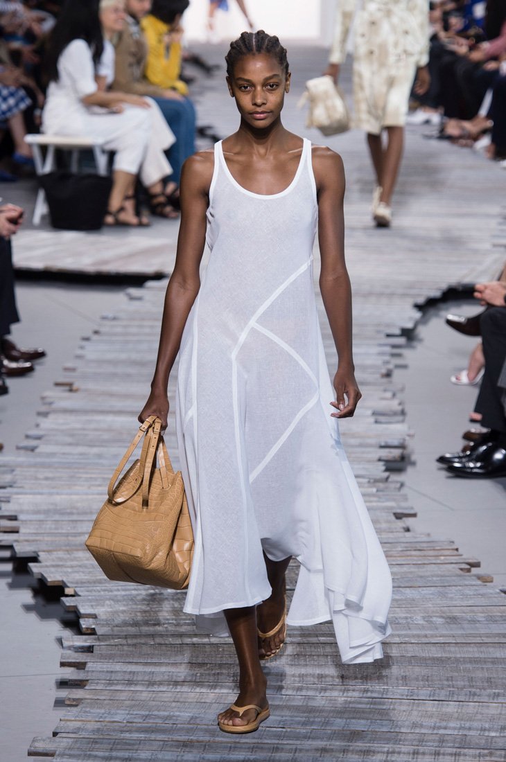 The leggy models sashayed onto the runway in a Hawaiian-chic kind of clothing – think Aloha sweats, fresh large trousers and one big scarf-necklace that could have doubled as a Hawaiian insignia. Even the lightweight coats featured a leafy pattern, heading towards a garden-fresh vibe with colors skewing from baby blue to white. Maxi pink knits were paired with color-matching light dresses and pinstriped trousers were rendered more summery with a calmer color palette. The models sported tongs at times and heeled sandals at other times, highlighting the calming breeziness of the collection. The clothes shortly turned into sultry floral dresses at times and elegant culottes with straw sandals at other times. The designs were all bracketed with a light continuum of colors, all of which made the collection mood board very clear: the calmer, the better.