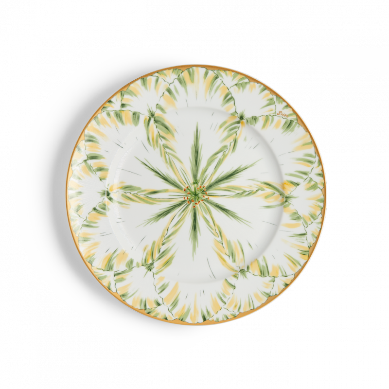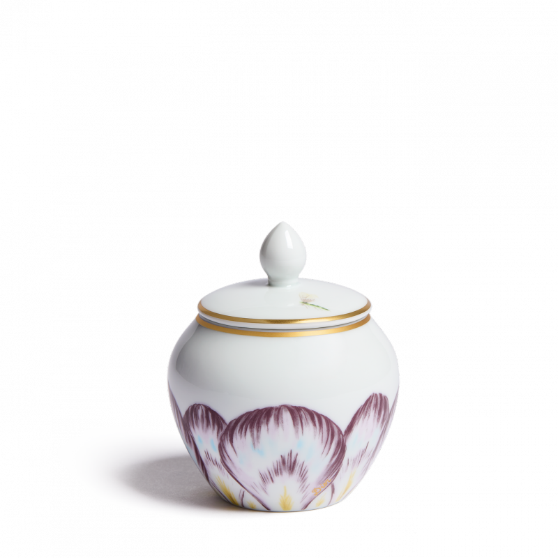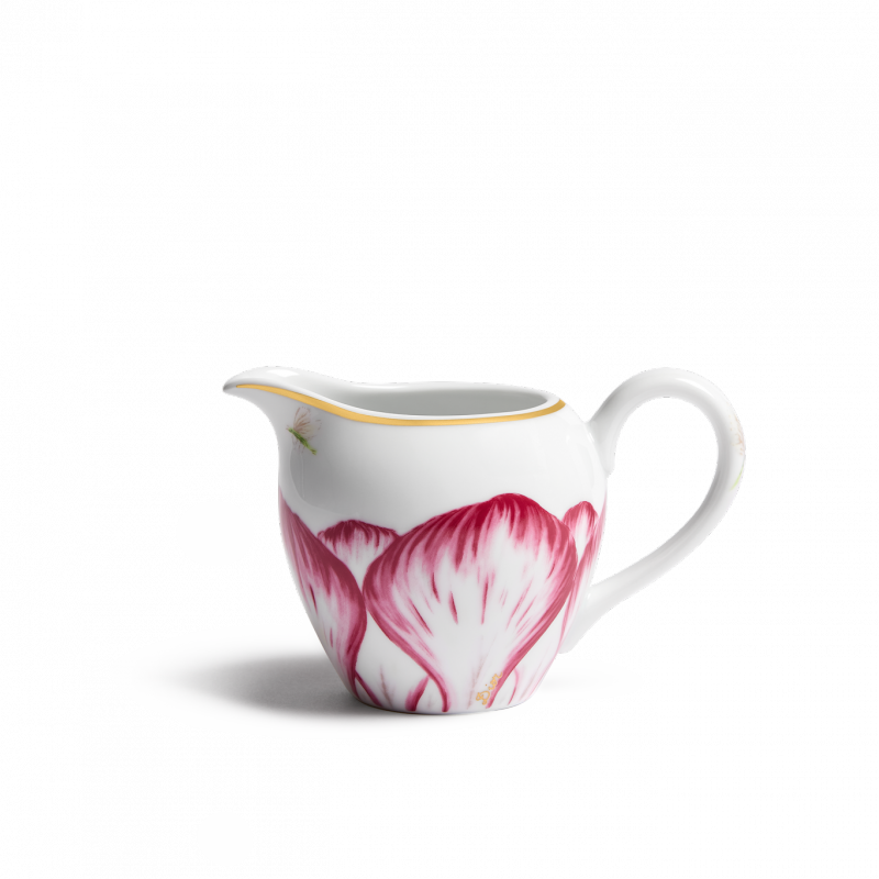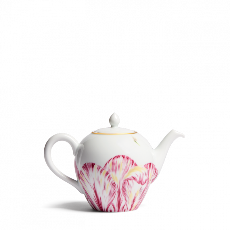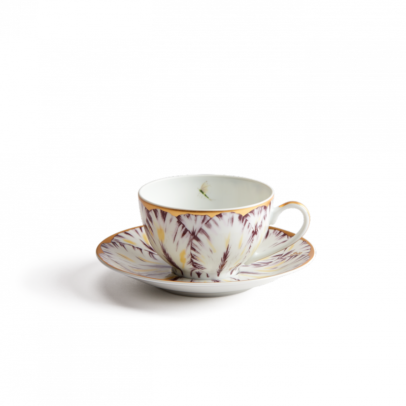 Available in four shades, the collection features graceful petals blooming across platters, dinner and dessert plates, as well as tea and coffee sets. Each piece is crafted from Limoges porcelain and enhanced with 24-karat gold details, reflecting the finesse of hand-painted decoration. The motif extends to a teapot, cream jug, and sugar bowl in rich plum tones, adding depth and elegance.