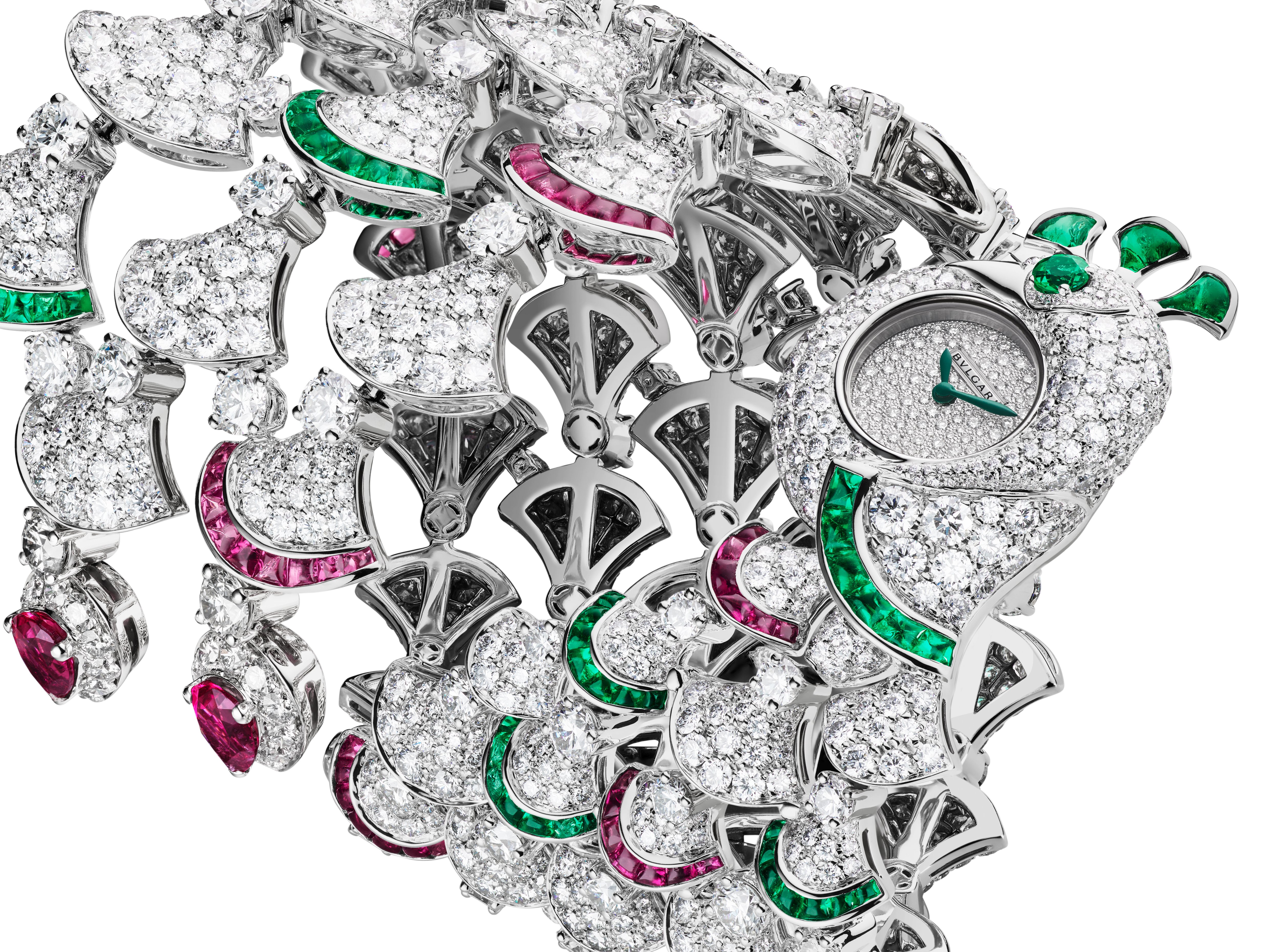 In the Pavone Bracelet watch, the peacock – sacred to Roman mythology – unfurls in a dazzling choreography of diamonds, emeralds and rubellites, transforming the wrist into a canvas of movement and light.