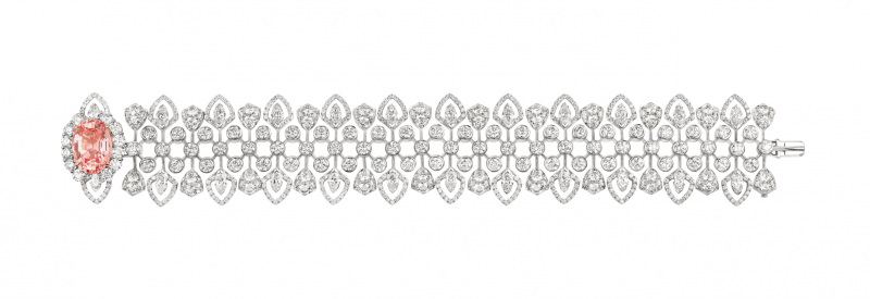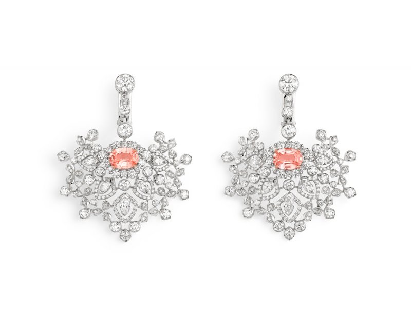 Think lace-like diamond motifs evoking snowflakes, or Russian decorative patterns lit up by the light blue of Ceylon sapphires that recall the day sky, or by the orangey pink of Padparadscha sapphires embodying dawn or dusk. These are exactly the natural scenes captured by this Chaumet high jewelry collection that comprises a transformable necklace, brooches, earrings, rings and a supple bracelet. Visit the Photo Gallery below to check these dreamy pieces and be the judge!