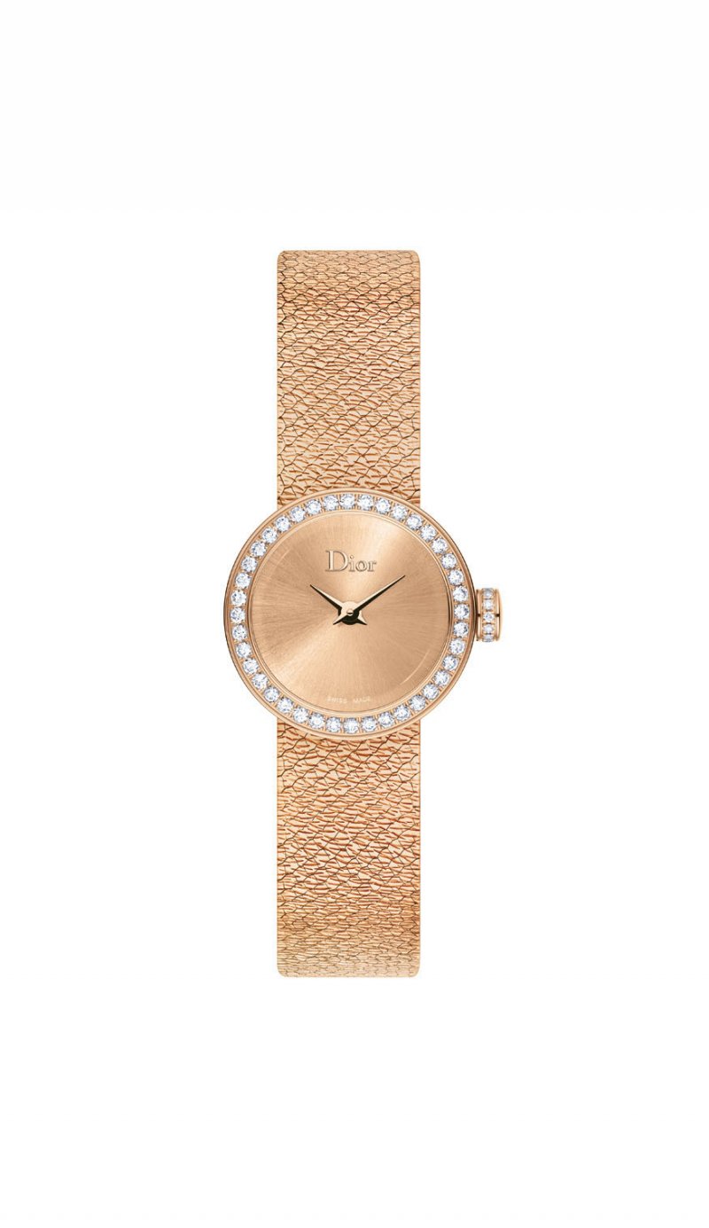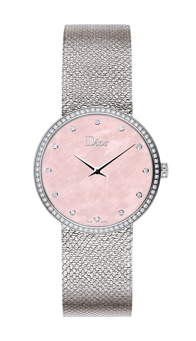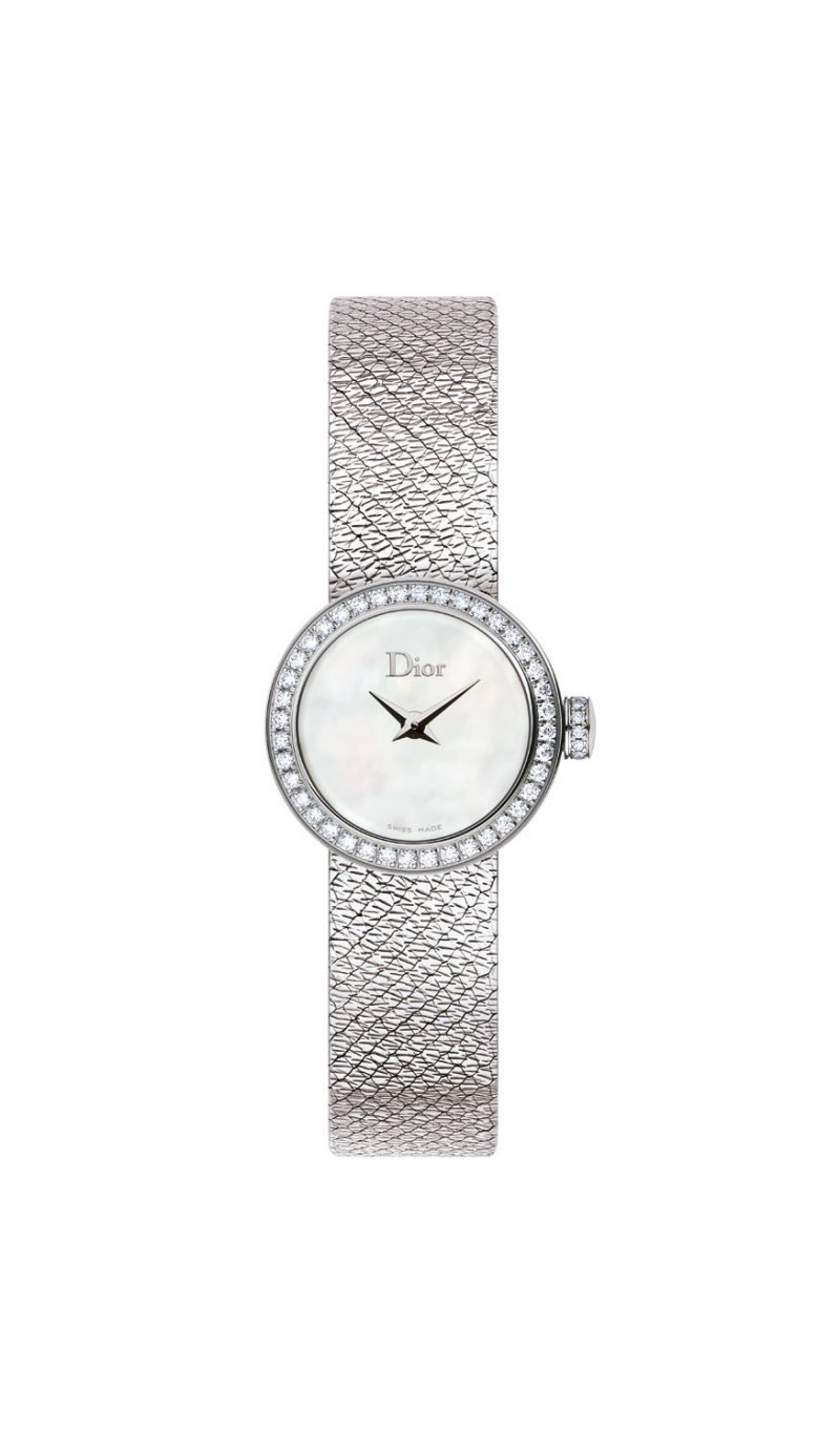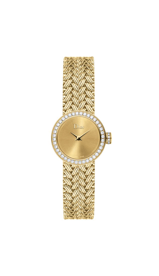 Crafted in the Dior Ateliers at La Chaux-de-Fonds, La D de Dior Satine transforms a goldsmith’s technique from the Renaissance into a precious time teller. The Milanese mesh is delicately woven with thousands of gold and steel threads entangled in a sparkling web like a beautifully embroidered haute couture fabric. This watch is rendered more feminine than it already is with a diamond-set bezel and crown, as well as a white or a pink mother-of-pearl dial that captures the light.