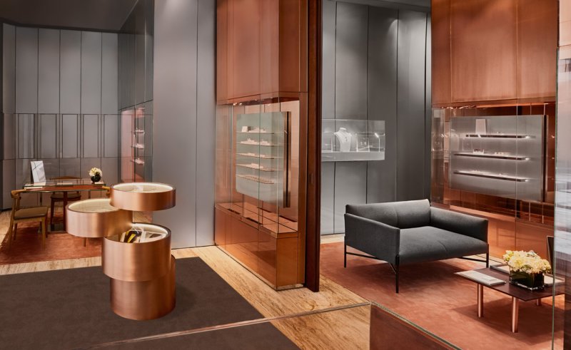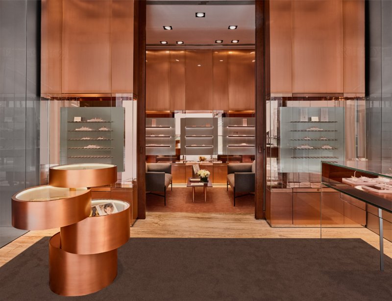 The store pays tribute to the historical flagship located at 6 Place Vendôme and showcases unconventional materials as part of an atypical jewelry boutique, where walls are coated with mat copper glass and where colored mirrors introduce various degrees of reflected colors in pink and grey.