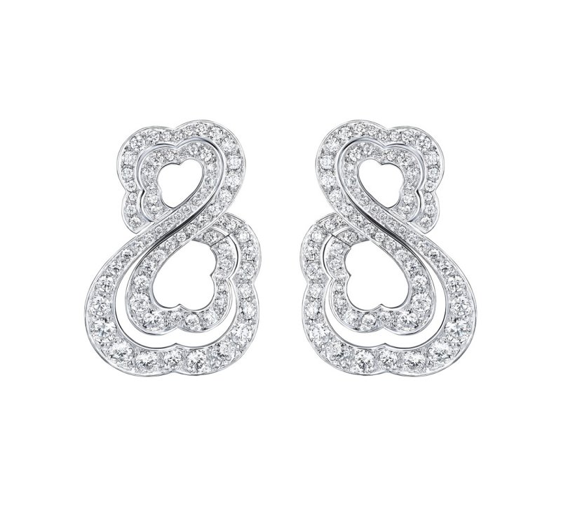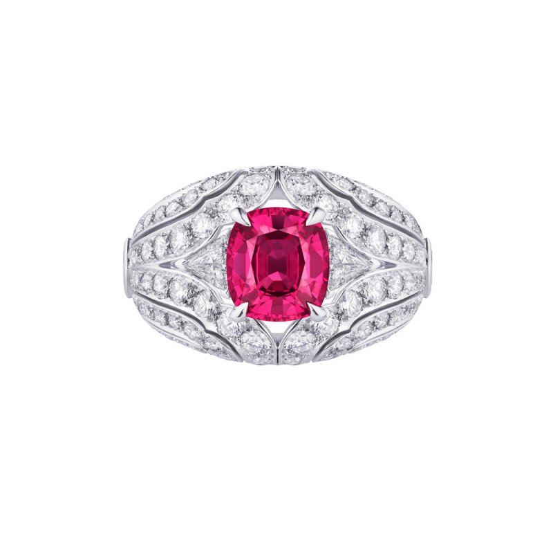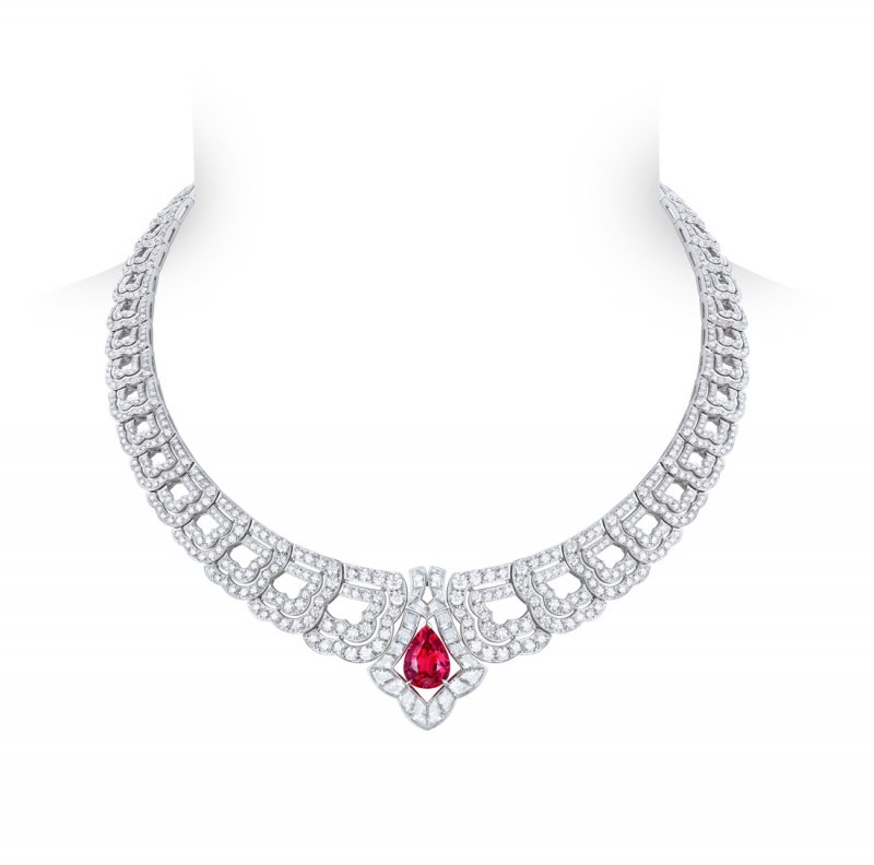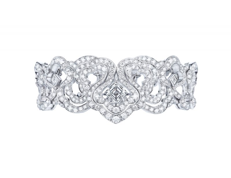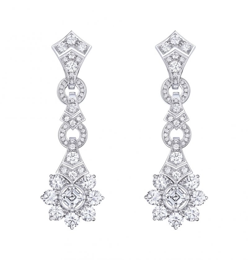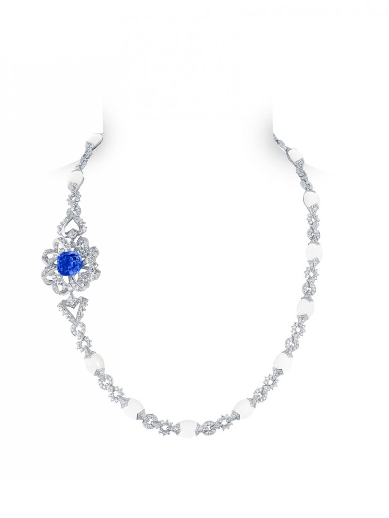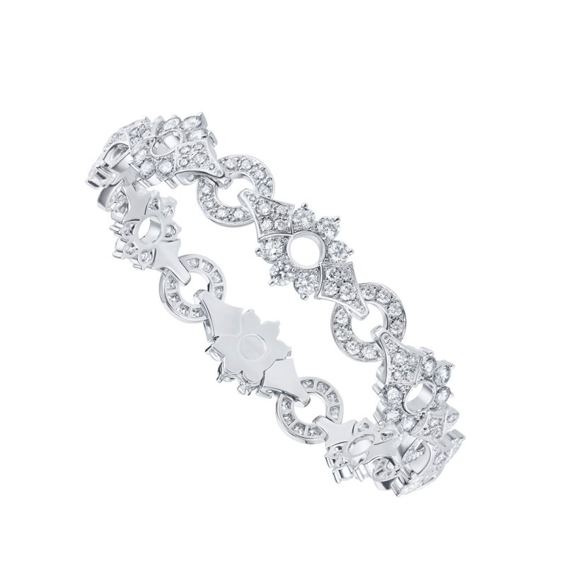 Seven parures and around 60 pieces encapsulate the House’s expertise that unfolds in the precious V shapes. Also a Louis Vuitton signature, flowers bloom on these exquisite high jewelry pieces, taking diamonds and precious stones as their charming color. And as these two signature motifs subtly merge, they become indistinguishable in a new graphic design.
