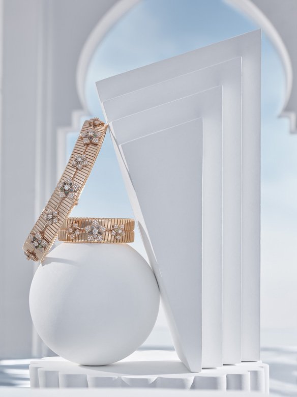 Starting with its story, this collection is inspired by the Princess’s grandparents who shared a one-of-a-kind love for their country and aimed to have peace in the region. But it holds more heritage to it than this love story because it also reflects the beauty of a shared heritage between two of the world’s most wonderful cities: Abu Dhabi and Rome, thus bringing together Italian and Middle Eastern women. All of this was embodied through Bvlgari’s marvels and the five-petal flower that adorns perfectly the interiors of the Grand Mosque in Abu Dhabi.