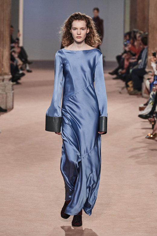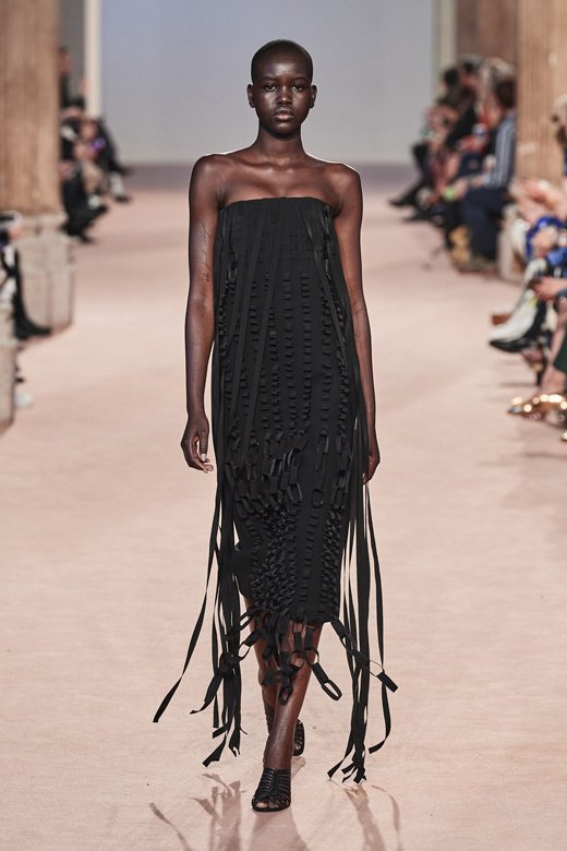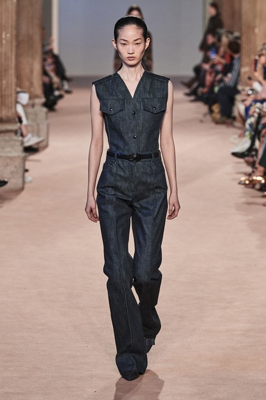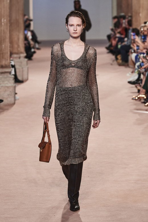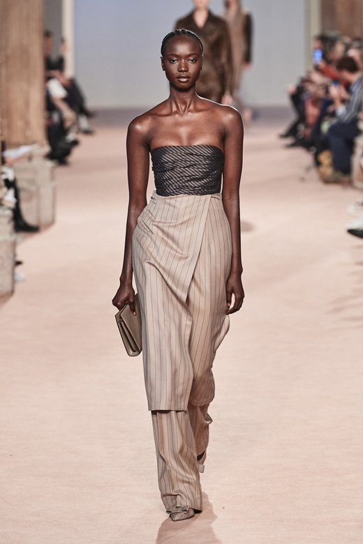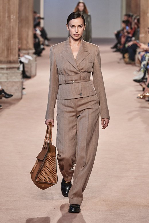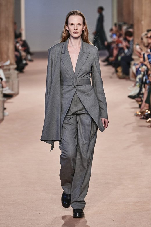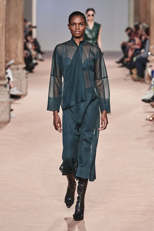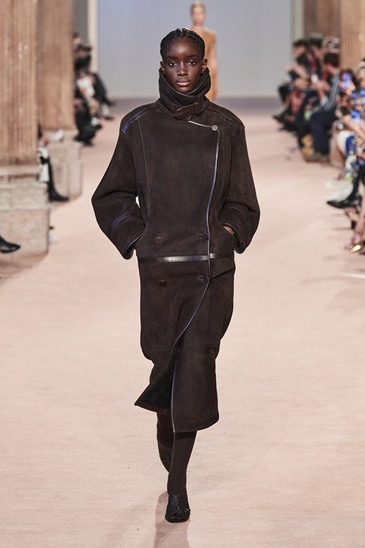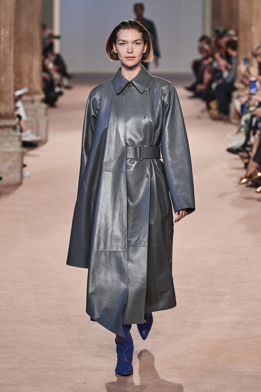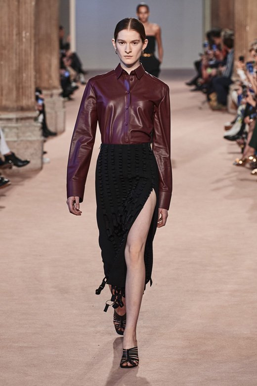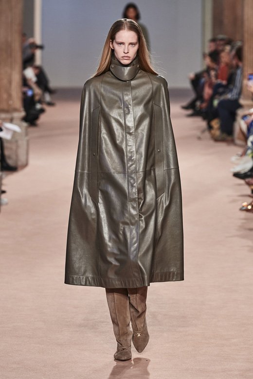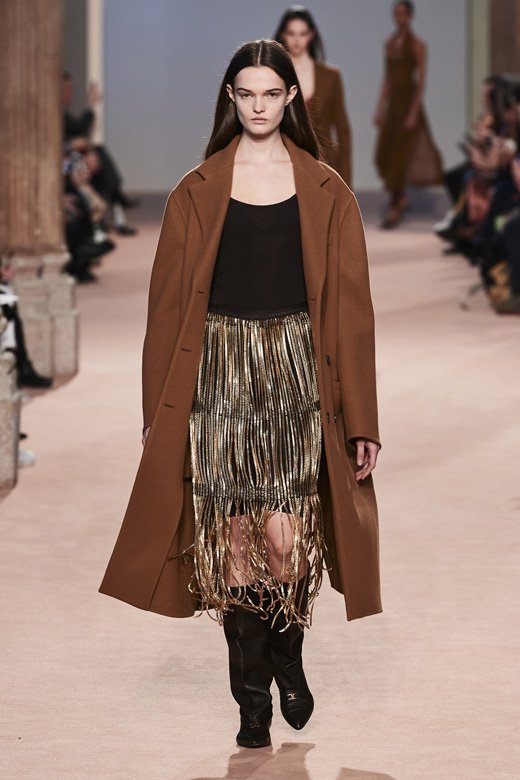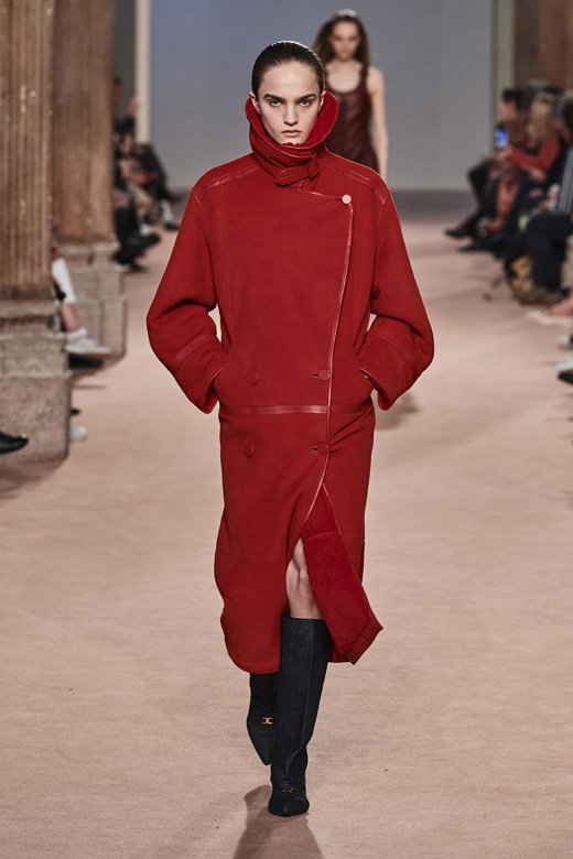 The pieces were all injected with some sort of working girl elegance, as there were maxi loose coats with high-slit midi skirts at times and high-waisted trousers with matching blazers at other times. But it was all far from being classic, as we saw a series of “I want it now” pieces, from the metallic high-waisted fringed midi skirt to the metallic leather cape and a red fit-forming leather jumpsuit that had sass written all over it. Doutzen Kroes made a fabulous appearance in a red leather coat that fitted her like a glove.